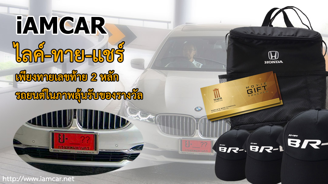 iAMCAR มีกิจกรรมอยากให้แฟนคลับร่วมสนุก ( ไลค์ – ทาย – แชร์) เพียงแค่ กดไลค์ ==> ทายเลขท้าย 2 ตัวรถยนต์ BMW (ด้านล่าง) ที่ หนุงหนิง…สวิงแรง นำไปรีวิว ==> แชร์โพสต์แนะนำเพื่อนร่วมกิจกรรม เพื่อลุ้นรับของรางวัลดังนี้ รางวัลพิเศษ สำหรับผู้ที่ทายตัวเลขถูกคนแรก “Gift Voucher Major Cineplex 2 ใบ” จำนวน 1 รางวัล จับรางวัลสำหรับผู้ทายตัวเลขถูก (ผู้ได้รับรางวัลมีสิทธิ์ร่วมลุ้นรางวัลด้านล่างนี้ในกรณีที่ผู้ทายมากกว่า 4 ท…