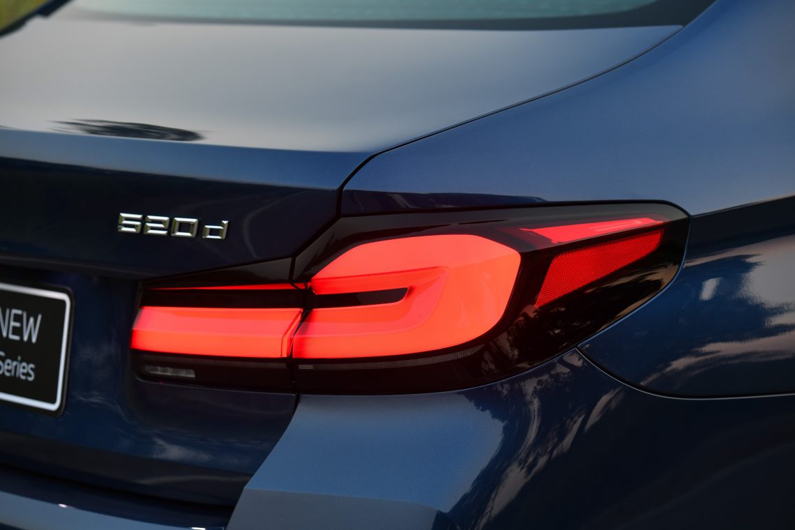 ดีไซน์ด้านท้ายรถสื่อถึงรูปลักษณ์ที่ผสานความสง่างามและล้ำสมัยด้วยเส้นสายที่คมชัดและทรงพลังเช่นเดียวกัน ไฟท้าย LED มาในรูปแบบสามมิติทรงตัว L รับกับไฟหน้า โฉบเฉี่ยวด้วยกรอบสีดำ สร้างความสะดุดตาบนท้องถนน โดยทั้งไฟท้ายและไฟเบรกได้รับการออกแบบมาให้กลมกลืนเป็นหนึ่งเดียว ทำให้บีเอ็มดับเบิลยู ซีรีส์ 5 ใหม่มีรูปโฉมที่ไม่ซ้ำใคร เสริมลุคสปอร์ตด้วยท่อไอเสียทรงสี่เหลี่ยมคางหมูที่ท้ายรถทั้งสองด้านซึ่งรวมเป็นส่วนหนึ่งของกันชนท้ายไว้ได้อย่างลงตัว