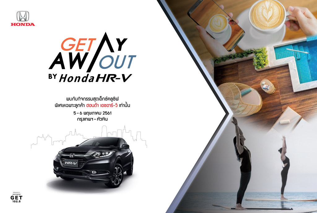 บริษัท ฮอนด้า ออโตโมบิล (ประเทศไทย) จำกัด ร่วมกับ คลื่นวิทยุเก็ตเรดิโอ GET 102.5 ชวนลูกค้าเจ้าของรถยนต์ฮอนด้า เอชอาร์-วี เปิดประสบการณ์สุดเอ็กซ์คลูซีฟ บนเส้นทางกรุงเทพ-หัวหิน ไปกับ ฮอนด้า เอชอาร์-วี ที่สุดแห่งยนตรกรรมสปอร์ตครอสโอเวอร์ระดับพรีเมียม ในกิจกรรม “GET Away Out by Honda HR-V” พร้อมร่วมเวิร์กช็อปการถ่ายภาพด้วยโทรศัพท์มือถือ อินเทรนด์กับการเล่นโยคะบนอุปกรณ์เหนือน้ำที่เรียกว่า Sub-Yoga พร้อมกิจกรรมต่างๆ ให้ร่วมสนุกและลุ้นรับของรางวัลพิเศษจากฮอนด้าอีกมากมาย ตลอดการเดินทาง 2 วัน 1 คืน ระหว่างวันเสาร์ที่ 5 – วันอาทิตย์ที่ 6 พฤษภาคม 2561 ณ อวานี หัวหิน รีสอร์ท แอนด์ วิลล่าส์ จังหวัดประจวบคีรีขันธ์