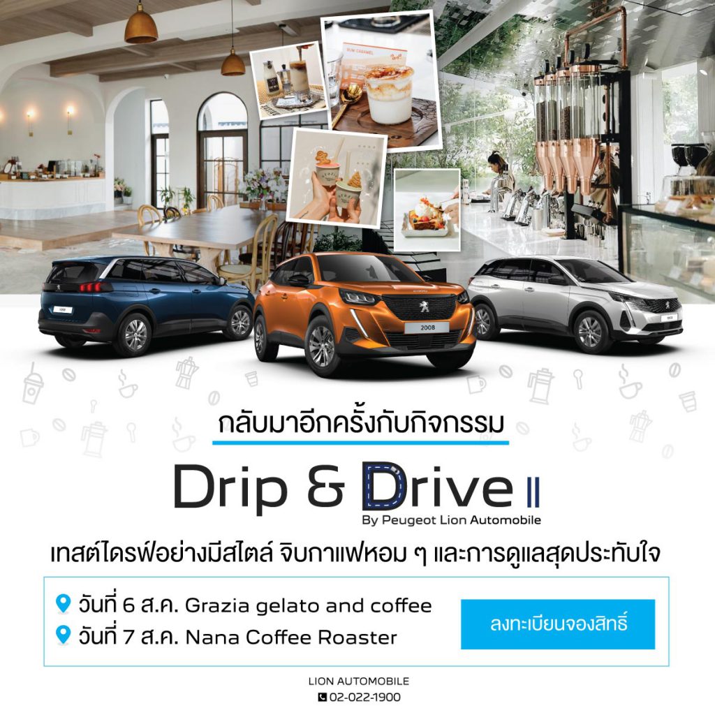 สำหรับลูกค้าที่กำลังมองหาเอสยูวีมาตรฐานยุโรป เชิญพบงาน Drip & Drive II By Peugeot Lion Automobile กิจกรรมทดลองขับอย่างมีสไตล์ พร้อมการดูแลสุดประทับใจ วันที่ 6 สิงหาคม ที่ร้าน Grazia gelato and Coffee และ 7 สิงหาคม ที่ร้าน Nana Coffee Roaster