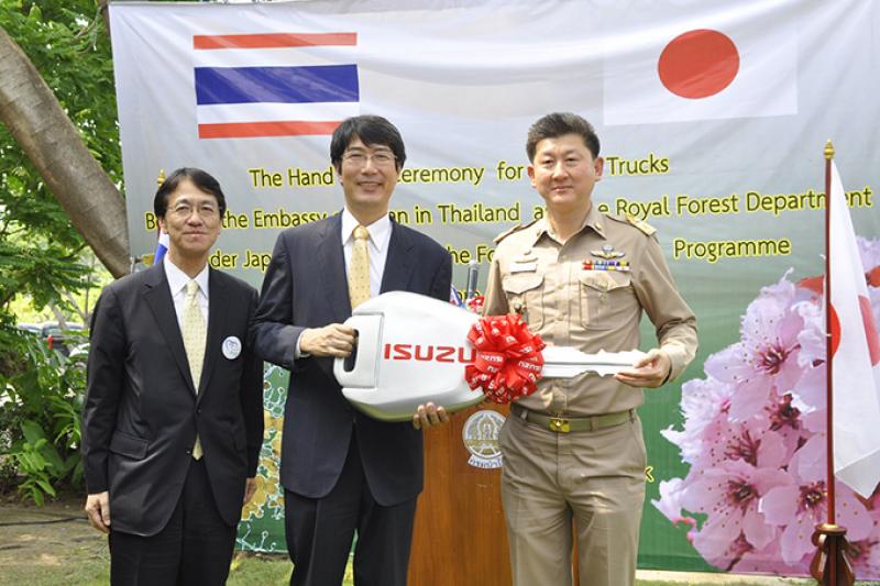 มร. ยาสุยูกิ คาโมดะ กรรมการรองผู้จัดการ (ซ้ายสุด) บริษัท ตรีเพชรอีซูซุเซลส์ จำกัด ร่วมในพิธีส่งมอบรถปิกอัพ “ออล-นิว อีซูซุดีแมคซ์ วี-ครอส” จำนวน 93 คัน ภายใต้โครงการความร่วมมือแบบให้เปล่าในแผนงานรักษาป่าไม้ของประเทศญี่ปุ่นกับกรมป่าไม้ เพื่อเพิ่มประสิทธิภาพการทำงานในการป้องกันรักษาป่าภายใต้ภารกิจงานส่วนกลางและส่วนภูมิภาค โดยได้รับเกียรติจาก มร. คิมิโนริ อิวามะ อัครราชทูตฝ่ายเศรษฐกิจ ประจำสถานเอกอัครราชทูตญี่ปุ่นประจำประเทศไทยเป็นผู้ส่งมอบ และมีนายบุญชอบ สุทธมนัสวงษ์ อธิบดีกรมป่าไม้เป็นผู้รับมอบ