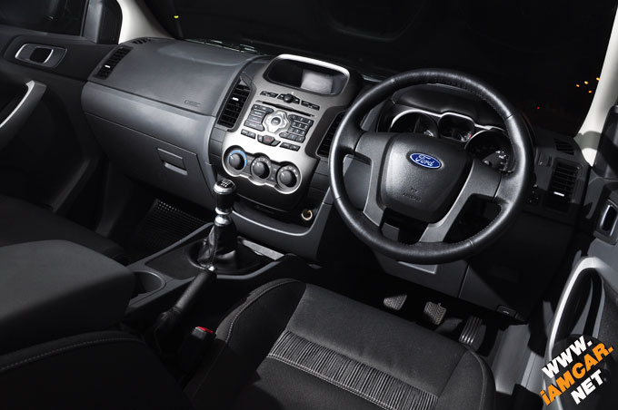 ดูต่อกันที่ภายในซึ่งคุมโทนสีด้วยดำสลับบรอนซ์ มองโดยรวมคล้ายๆ กับการนำคอนโซลของ FORD Fiesta มาพัฒนาต่อให้ดูแกร่งเหมาะที่จะเป็นคอนโซลของรถกระบะ เพราะ FORD กำลังสร้าง “DNA” เพื่อให้ผู้บริโภครู้สึกทุกครั้งเมื่อเข้าไปนั่งในรถว่านี้ คือ “FORD” การดีไซน์ภายในไม่ว่าจะเป็นรถยนต์นั่งหรือกระบะจะดีไซน์ไปในทิศทางเดียวกัน ปรับบางส่วนให้เหมาะสมกับรถแต่ละประเภทเท่านั้น โดย All-New FORD Ranger ออกแบบให้เป็นทรงเหลี่ยมมากขึ้นโดยการปรับช่องแอร์ให้เป็นสี่เหลี่ยม พวงมาลัยเป็นแบบสี่ก้านหุ้มหนัง หัวเกียร์หุ้มหนัง ส่วนเบาะนั่งทุกจุดเป็นแบบผ้าพรีเมี่ยม