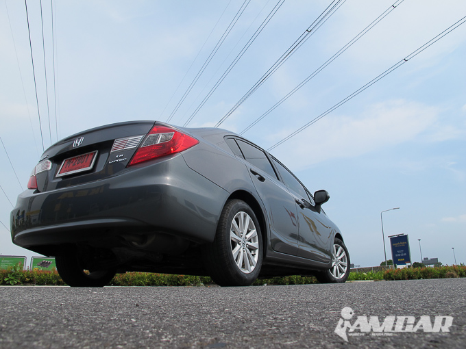 ครั้งแรกที่ผมได้เห็น All New HONDA Civic ตัวเป็นๆ คงเป็นที่งาน Bangkok International Motor Show 2012 ที่ผ่านมา ซึ่งหลังจากนั้นหนึ่งเดือนก็มีการทดสอบแบบกลุ่ม ซึ่งผมได้บรรยายรวมๆ เอาไว้แล้ว แต่ในหน้านี้ผมขอเจาะลึกถึง All New HONDA Civic 1.8 E AT Navi ตัว Top สุดของรุ่น 1.8 ลิตร คันที่ผมจะเอาออกไปทดสอบสมรรถนะ ซึ่งคันนี้ถือได้ว่าเป็นเจนเนอเรชั่นที่ 9 ของตระกูล Civic โดยใช้รหัสตัวถังว่า “FB” (หรือ Facebook นั่นเอง) ล้อเล่นนะครับ ในรุ่นนี้รูปทรงภายนอกดูแล้วโฉบเฉี่ยวขึ้น โดยการออกแบบภายนอกตามคอนเซ็ปท์ Clean & Energetic ซึ่งตั้งใจออกแบบตัวถังแบบ mono – from ให้ดูมีพลังและปราดเปรียว ในรุ่นนี้มีฐานล้อแคบกว่ารุ่นเดิม 30 มม. ใช้วัสดุที่มีน้ำหนักเบาลง เพื่อช่วยในเรื่องของความประหยัดเชื้อเพลิงที่ดีขึ้น โครงสร้างตัวถังแบบ G-CON ที่เข้ามามีส่วนช่วยเพิ่มความสามารถในการกระจายแรงกระแทกที่เกิดขึ้นในระหว่างการชนทางด้านหน้า เพื่อลดความเสียหายลง และใช้เหล็กที่มีความแข็งแกร่งสูงมากถึง 55% ในขณะที่รุ่นเดิมมีการใช้เหล็กประเภทนี้เพียง 50% เท่านั้น จึงมีความทนทานต่อการบิดตัวดีขึ้นถึง 10% และมีความปลอดภัยสูงขึ้น นอกจากนี้ยังมีการออกแบบให้เสา A-Pillar มีขนาดที่เพรียวขึ้น ช่วยเพิ่มทัศนวิสัยในการขับขี่ดีขึ้น