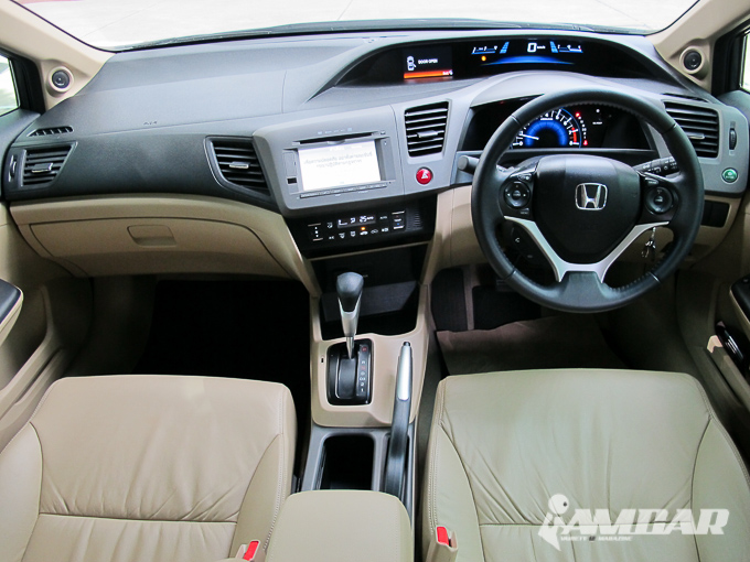 ส่วนพระเอกในส่วนของภายในต้องยกให้สวิตช์เปิด-ปิดระบบ ECON Mode ซึ่งอยู่บนแผงคอนโซลฝั่งขวาของผู้ขับ ควบคุมการทำงานของเครื่องยนต์ เกียร์ และระบบปรับอากาศ เพื่อให้ใช้พลังงานอย่างคุ้มค่าที่สุด ที่ขาดไม่ได้จอเอนกประสงค์ i-MID หรือ Intelligent Multi-Information Display ตัวชูโรงของ Civic ใหม่ สามารถแสดงข้อมูลและปรับเซ็ตระบบต่างๆ ของรถ ควบคุมด้วยปุ่มบนพวงมาลัยฝั่งซ้าย คอนโซลกลางติดตั้งจอสัมผัสสำหรับแสดงผลระบบเครื่องเสียง ระบบ Navigator และเป็นกล้องมองหลังพร้อมเส้นกราฟิกกะระยะ ถัดลงมาเป็นชุดควบคุมเครื่องปรับอากาศ และคอนโซลเกียร์ พวงมาลัย 3 ก้านหุ้มหนังปรับได้ 4 ทิศทาง ที่ก้านฝั่งขวามีสวิตช์ควบคุมครูสคอนโทรล และที่ด้านล่างซ้ายของพวงมาลัยมีสวิตช์รับ-วางสายโทรศัพท์ที่เชื่อมต่อผ่านระบบ Bluetooth ที่เท้าแขนกลางเบาะหน้ามีช่องเสียบ USB เบาะผู้ขับปรับไฟฟ้า 8 ทิศทาง ส่วนเบาะผู้โดยสารด้านหน้าปรับมือ ผมว่าเรื่องความกว้างขวางของภายในทั้งตอนหน้า – หลังโอ่โถ่งระดับดี เทคโนโลยีที่เพิ่มขึ้นมามาก แม้จะต้องศึกษาก่อนใช้งานเพื่อให้ใช้ได้ครบทุกออฟชั่น คุณภาพของวัสดุอยู่ในเกณฑ์ดีทั้งหมด แต่จุดที่ชูในส่วนของการเก็บเสียงห้องโดยสารที่เพิ่มขึ้นมาถึง 5 จุดเท่าที่ผมสัมผัสยังมีการเล็ดรอดของเสียงจากลม และ สภาวะภายนอกอยู่พอสมควรครับ