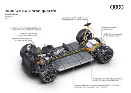 โดยแบตเตอรี่ของ Q4 35 e-tron มีขนาดอยู่ที่ 52 kWh ส่วน Q4 40 e-tron และ Q4 50 e-tron quattro มีขนาด 77 kWh สามารถขับขี่ได้เป็นระยะทางสูงสุด 520 กิโลเมตรต่อการชาร์จแต่ละครั้ง และมีมิติตังถังอยู่ที่ ความยาว 4,588 มม. กว้าง 1,865 มม. และสูง 1,632 มม. โดยมีระยะฐานล้อที่ยาว 2,760 มม.