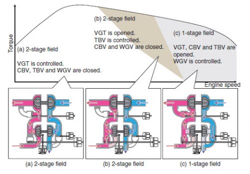 ซึ่งเทอร์โบทั้ง 2 ตัวจะถูกควบคุมด้วยระบบอิเล็กทรอนิกส์ ประกอบด้วย High Pressure Turbo แบบ Variable Geometry Turbocharger หรือเทอร์โบแปรผัน สำหรับช่วงแรงดันสูง และ Low Pressure Turbo สำหรับช่วงแรงดันต่ำ โดยใช้ Waste gate Type Turbocharger ช่วยเสริมการทำงาน