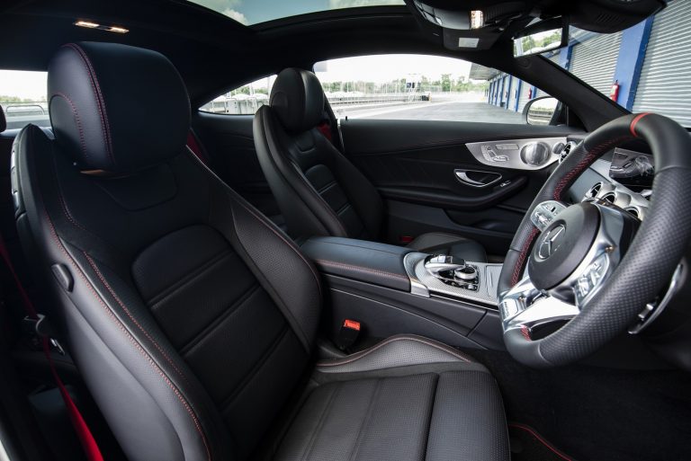 ด้านภายในห้องโดยสารเปี่ยมด้วยความหรูหรา ผสานด้วยกลิ่นอายความสปอร์ตกับการตกแต่งในสไตล์ AMG Matt Silver และ Glass-Fibre พร้อมการติดตั้งชุดเบาะนั่ง AMG Sport Seat หุ้มด้วยวัสดุหนังแท้ พร้อมระบบทำความร้อน และความเย็นที่ปรับได้ 3 ระดับ ตลอดจนการออกแบบพนักพิงหลัง และปีกเบาะให้โอบกระชับรับสรีระได้มากขึ้น