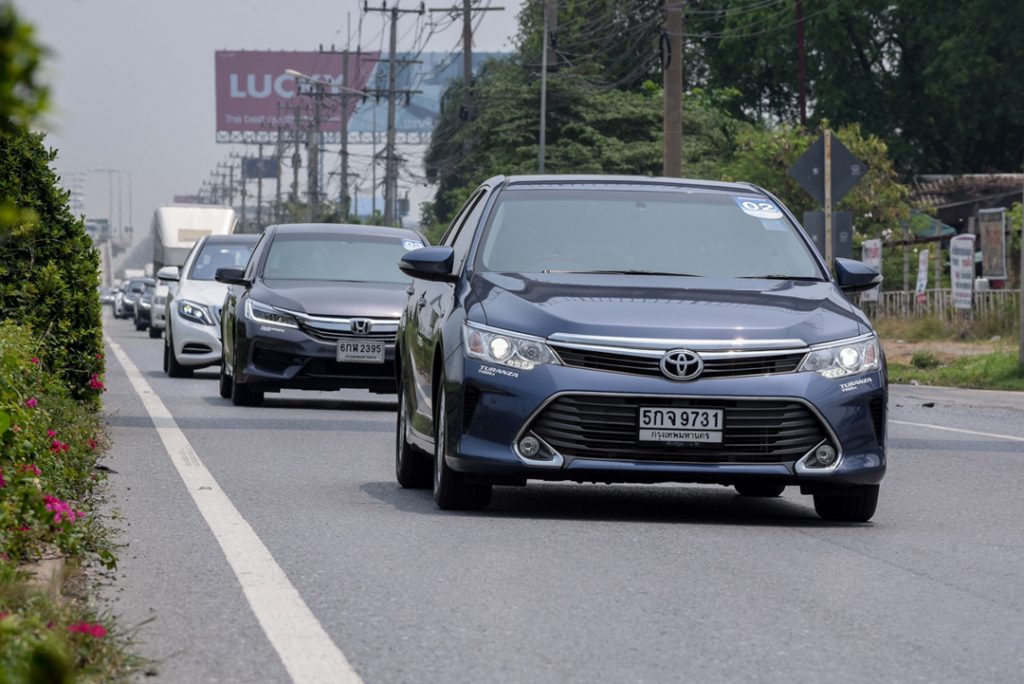 เมื่อรู้จักว่าข้อดีที่เพิ่มจากเดิมมีอะไรบ้าง คราวนี้ก็ได้เวลาการทดลองว่าดีจริงไม ทาง Bridgestone เตรียมรถหลากหลายรุ่นทั้ง Mercedes-Benz S300 , Honda Accord และ Toyota Camry ซึ่งรถแต่ละคันจะมี “คาแรคเตอร์” ส่วนตัว เช่น Mercedes-Benz S300 นุ่มเงียบมาเป็นทุน Honda Accord จะขับแบบสปอร์ตหน่อย ช่วงล่างคมๆ Toyota Camry จะออกนุ่มนวลสบายๆ รถที่ผมได้ลองขับเป็น Toyota Camry ซึ่งรถรุ่นนี้มีความนุ่มนวลเป็นทุนอยู่แล้ว เราเริ่มออกเดินทางกันโดยใช้ทางด่วนมุ่งหน้า Motor Way อย่างแรกเลยครับผมลองในเรื่องของการเก็บเสียงของยางก่อน โดยวิ่งผ่านรอยต่อของถนน ขับเหยียบตาแมว หรือจะเป็นเส้นถนนสั่นสะเทือนกันง่วงก่อนเข้าด่านจ่ายเงิน สัมผัสได้นะว่าเสียงที่เข้ามาในโดยสารมีน้อยลง แรงกระแทกเวลาขับทับตาแมวบนถนนส่งผลมาที่พวงมาลัยก็มีน้อยกว่าปกติ ข้อดีอีกอย่างของยางที่ดูดซับแรงสะเทือนได้ดีคือลดการทำงานของช็อคอัพช่วยให้ยืดอายุของช่วงล่างให้พังช้าลงใช้งานได้นานขึ้น ก็ไม่น่าเชื่อว่าแค่ทาง Bridgestone เพียงเลือกใช้จำนวนและรูปลักษณ์ของบล็อกดอกยางที่ไม่เท่ากัน บวกกับร่องดอกยางที่ถูกปรับให้อยู่ในมุมที่เหมาะสม จะสามารถช่วยให้ได้ความรู้สึกที่ดี ทำให้รถมีความลักซ์ชัวรี่ นุ่มนวลมากขึ้นพอสมควร