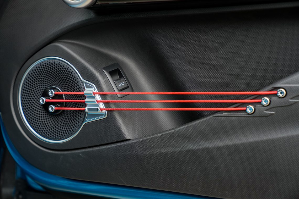 ไล่มาถึงแผงประตู บริเวณช่องเก็บ เรียกว่าเป็นอีกจุดที่ดึงดูดสายตาไม่น้อย ด้วยงานออกแบบที่คล้ายกับหยิบยืมดีไซน์เครื่องดนตรีเครื่องสายมาใช้ ซึ่งข้อดีก็คือด้วยความยืดหยุ่น ทำให้คุณสามารถใส่ของชิ้นใหญ่ได้ แต่คำถามต่อมาก็คือใช้ไปนานๆ มันจะ “ยืดยาน” มั้ยนะ