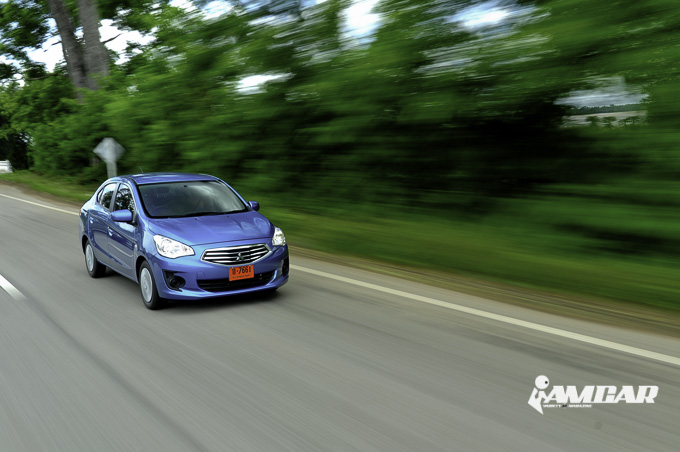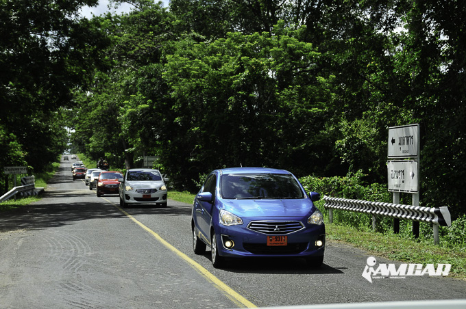 แค่ภายนอกผมก็เล่าจนเกือบออกเดินทางไม่ทันคนอื่นเค้าแล้ว พอได้กุญแจระบบอัจฉริยะ KOS (Keyless Operaton System) ก็รีบวิ่งไปขึ้นรถเพียงคุณอยู่ในระยะ 70 ซม. จากตัวรถคุณสามารถที่จะเปิดประตูและฝากระโปรงท้ายได้เลย ระบบจะปลดล็อคให้อัตโนมัติ เมื่อเข้ามานั่งในตำแหน่งผู้ขับขี่ การปรับเบาะและกระจกข้าไฟฟ้าสามารถพับเก็บอัตโนมัติในตำแหน่งพร้อมเดินทาง เหยียบเบรก กดปุ่ม “Engine Start” ติดเครื่องพร้อมเดินทาง โดยมีสาวๆ สวยๆ พนักงานขายของโชว์รูมมาโบกไม้โบกมือส่งคณะออกเดินทาง ในช่วงแรกของการเดินระยะทาง 54 กม. เพื่อมุ่งหน้าไปนมัสการพระธาตุพนมเอาฤกษ์เอาชัยกันก่อน โดยการขับขี่ในช่วงเช้าทางมิตซูบิชิวางแผนให้สื่อมวลชนขับแบบใช้งานจริงตามมาตรฐานความเร็วที่กฎหมายกำ หนด เพื่อจะได้วัดอัตราความสิ้นเปลือง ผมจึงใช้ความเร็วในการเดินทางประมาณ 100 – 110 กม./ชม. ในการขับรถชิวๆ แบบนี้เดี๋ยวจะหลับซะก่อน ผมขอเล่าให้ฟังเกี่ยวกับภายในดีกว่า คันขอผมเป็นรุ่น Top ที่สุดคือ Attrage GLS Ltd. มีออฟชั่นมาให้เต็มเปี่ยม
