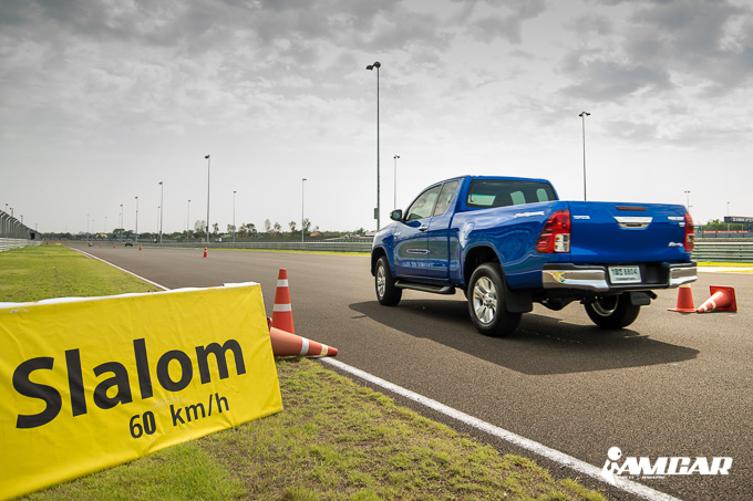 รู้จักตัวรถกันไปแล้วมาเริ่มการทดสอบในแบบที่ 1 จะเป็นการขับในแทร็ก สนามช้างอินเตอร์เนชั่นแนลเซอร์กิต ซึ่งเป็นการทดสอบในเรื่องของการควบคุมพวงมาลัย การตอบสนองของช่วงล่างในการเข้าโค้งรูปแบบต่างๆ หรือจะเป็นการเปลี่ยนเลนแบบฉับพลัน และที่สำคัญคือ ตัวทีเด็ดของระบบ iMT ซึ่งเข้ามาชดเชยรอบเครื่องยนต์ในขณะที่คุณเปลี่ยนเกียร์ขึ้น-ลง ประโยชน์ของระบบนี้ทำให้การเปลี่ยนเกียร์รวดเร็วมากขึ้น จังหวะการเปลี่ยนก็นุ่มนวลมากขึ้นด้วย ส่วนเรื่องระบบช่วงล่างนั้นถือว่าเป็นนวัตกรรมใหม่ของกระบะเมืองไทยเนื่องจากอาการท้ายเหวี่ยงหรือ Over Steer ซึ่งกระบะท้ายเบาๆ มักจะเป็นเวลาเข้าโค้งหรือออกจากโค้งแรงๆ แต่สำหรับ TOYOTA Hilux Revo Smart Cab “โตโยต้า รีโว สมาร์ทแค็บ” หายเป็นปลิดทิ้งครับ ในสนามเราได้ขับกันท่านละ 2 รอบ ซึ่งจะใช้ Eco Mode กับ Power Mode ผลัดกันคนละรอบเพื่อให้เห็นพละกำลังที่ Power Mode สร้างออกมาได้อย่างชัดเจน กำลังเครื่องยนต์ถูกส่งผ่านไปยังล้อแบบรวดเร็วขึ้น สังเกตได้จากเวลาออกจากโค้งเรากดคันเร่งจมออกจากโค้งเช่นเดิม ตำแหน่งเดิม แต่จะสังเกตได้ว่าความเร็วที่ปลายโค้งจะมากกว่าเดิม