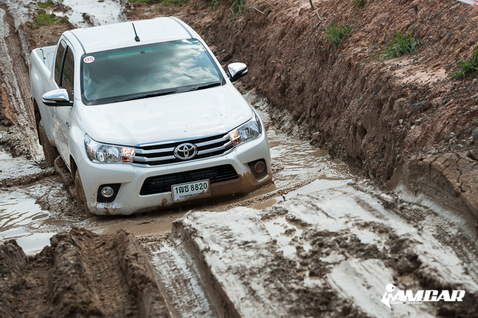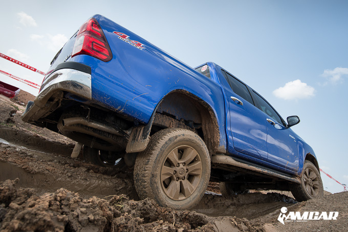 จากนั้นเรายังได้ทดสอบการขับขี่แบบ Off Road โดยใช้รุ่น 4 ประตู ขับเคลื่อนสี่ล้อ ในสถานีนี้มีการทำสนามขึ้นมาใหม่ มีทั้งการลุยโคลน, ฝ่าแอ่งน้ำ, ขึ้น-ลงเนินชันรูปแบบต่างๆ ในการทดสอบเราใช้โหมดการขับขี่แบบ 4L ซึ่งเน้นการเรียกแรงบิดมากเป็นพิเศษให้ลงสู่ระบบขับเคลื่อนทั้งสี่ล้อ อุปสรรคแรกเป็นการฝ่าดินโคลนเหลวๆ ไปพร้อมกับการปีนป่ายเนินสลับซ้าย – ขวา Revo ไม่ต้องใช้ทักษะการขับขี่มากมาย เพียงคุณควบคุมคันเร่งควบคู่ไปกับการควบคุมทิศทางพวงมาลัยเท่านั้นเราก็สามารถผ่านไปได้อย่างง่ายดาย ต่อมาเป็นเนินชันเพื่อทดสอบระบบช่วยออกตัวบนทางลาดชัน (HAC) และระบบควบคุมความเร็วขณะลงทางลาดชัน (DAC) โดยในโหมดขับเคลื่อนสี่ล้อแบบ 4L จะช่วยรักษาแรงดันเบรกเพื่อออกตัวบนทางลาดชันเป็นเวลา 3 วินาที เพื่อให้ผู้ขับขี่เหยียบคันเร่งออกไปโดยไม่ทำให้รถไหล ขณะที่โหมดขับเคลื่อนแบบ 4H และ 2WD จะรักษาแรงดันเบรกไว้ไม่เกิน 3 วินาที หรือจนกว่าผู้ขับขี่จะเหยียบคันเร่งออกไป ส่วนระบบควบคุมความเร็วขณะลงทางชัน DAC ตัวระบบจะสั่งลดความเร็วลงทันทีเมื่อเซ็นเซอร์ตรวจพบว่ามีการลงทางลาดชัน ช่วยให้ผู้ขับขี่ไม่จำเป็นต้องเลี้ยงเบรกเข้าช่วย เพียงแต่คอยควบคุมพวงมาลัยเท่านั้นเอง ซึ่งความเร็วของตัวรถจะขึ้นอยู่กับองศาความชันที่เป็นอยู่ในขณะนั้น ยิ่งชันมากความเร็วจะยิ่งลดน้อยลงไปเรื่อยๆ