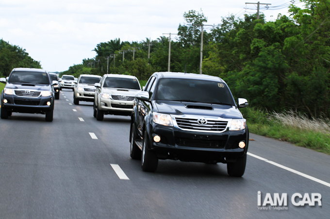 เริ่มการทดสอบในรูปแบบใหม่ของค่ายโตโยต้าที่ใช้รถตำรวจเปิดนำทาง เพื่อความปลอดภัย ในช่วง 120 กม. แรก ผมเป็นผู้โดยสารที่ดีก่อน สิ่งแรกที่ผมสัมผัสได้อย่างชัดเจนสำหรับ Vigo ใหม่ คือ ความนิ่มนวลของช่วงล่างเรื่องนี้ชัดเจนครับ การปรับช่วงล่างแบบนี้เหมาะสำหรับเป็นรถในการเดินทางท่องเที่ยวมากขึ้น เพราะความแข็งกระด้างหายไปเยอะ ในส่วนของ Navi ก็ทำงานได้แม่นยำ ส่วนของเล่นใหม่ที่ติดมาด้วย คือ ระบบประมวลผลการขับประหยัดน้ำมันแบบ Real Tiime มันจะทำงานด้วยการแสดงผลเป็นแท่งกราฟ และคำนวณคะแนนจากการประมวลผลนิสัยการขับขี่ของผู้ขับ จึงทำให้เราสามารถเรียนรู้และปรับนิสัยการขับขี่ เพื่อความคุ้มค่าในการใช้เชื้อเพลิงมากขึ้น