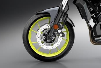 YAMAHA MT-07 ใช้ระบบกันสะเทือนด้านหน้าแบบ เทเลสโคปิค ADJUSTABLE 41 มม. INVERTED FORK ล้อหน้าเป็นแบบล้อแม็กซ์ อลูมิเนียม ขนาด 17 นิ้ว ยางหน้าขนาด 120/70 ZR17 M/C 58W ระบบเบรกหน้าเป็นแบบ ดิสก์เบรก แบบลูกสูบคู่ 282 มม. พร้อม ABS