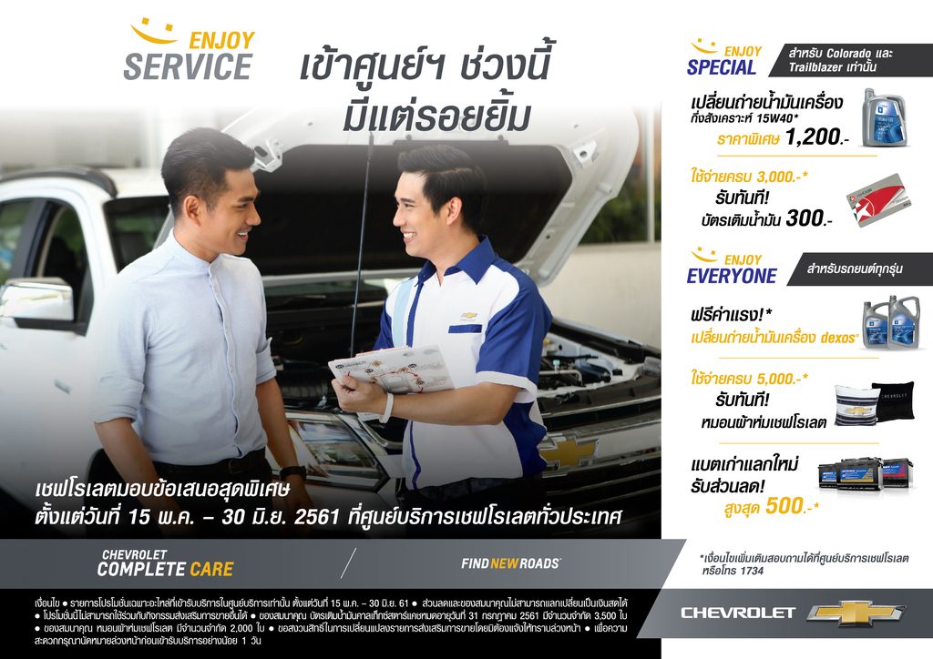 เชฟโรเลตได้เปิดตัวแคมเปญใหม่ “Chevrolet Enjoy Service 2018” หรือ “ชวนลูกค้าเข้าศูนย์ฯ ช่วงนี้มีแต่รอยยิ้ม” ซึ่งเป็นแคมเปญที่มุ่งเน้นการให้บริการสำหรับลูกค้าเชฟโรเลต พร้อมชวนเจ้าของรถยนต์เชฟโรเลตทั้งลูกค้าใหม่และลูกค้าปัจจุบัน นำรถของท่านเข้าไปใช้บริการที่ศูนย์บริการเชฟโรเลตทั่วประเทศ เพื่อรับสิทธิประโยชน์มากมาย ดังนี้