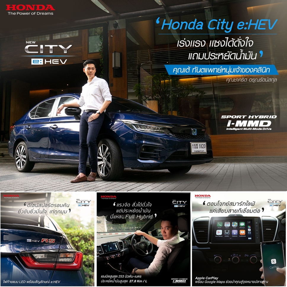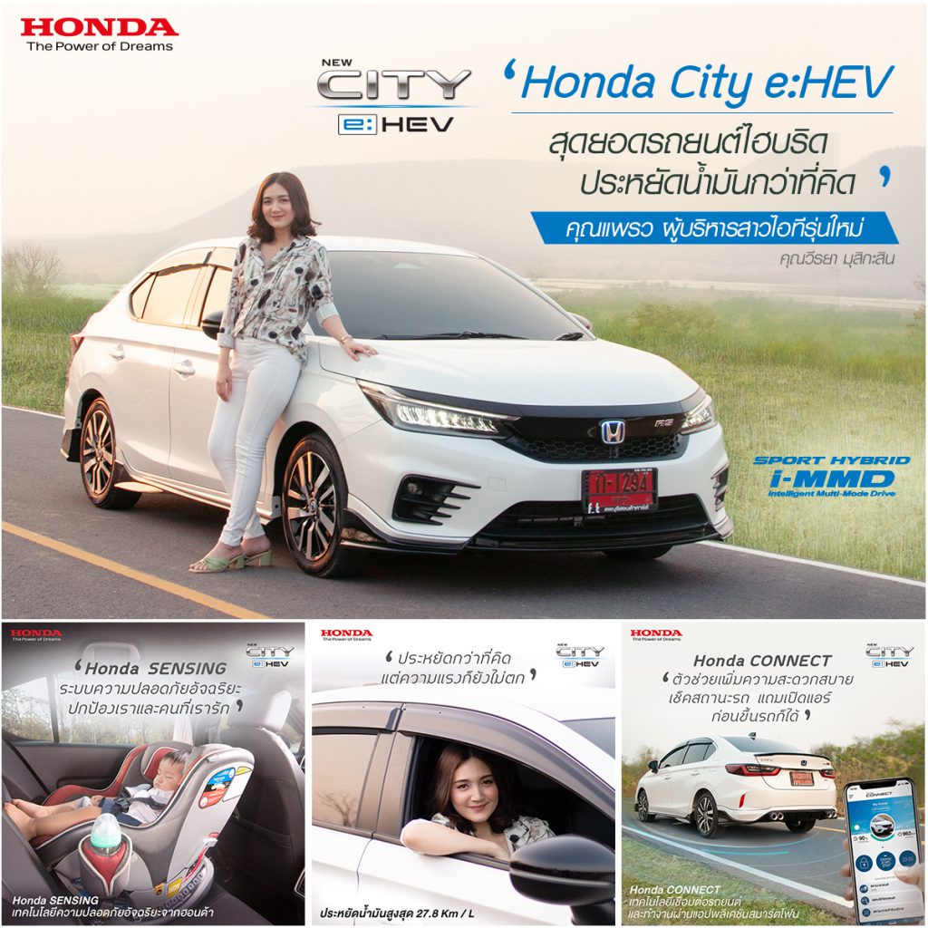 บริษัท ฮอนด้า ออโตโมบิล (ประเทศไทย) จำกัด เผยความนิยม ฮอนด้า ซิตี้ อี:เอชอีวี ใหม่ ยนตรกรรม Full Hybrid รุ่นแรกของเซกเมนต์ซิตี้คาร์ในประเทศไทย ภายใต้ “เดอะ ซิตี้ ซีรีส์” ซึ่งเป็นซิตี้คาร์ไฮบริดรุ่นแรกของเซกเมนต์ ที่มาพร้อมความคุ้มค่าที่เกินคาดและเกินคลาสในทุกด้านด้วยเทคโนโลยีที่เชื่อมต่อไปสู่การขับเคลื่อนแห่งอนาคต ระบบขับเคลื่อนไฮบริด Sport Hybrid i-MMD มั่นใจในทุกการขับขี่กับเทคโนโลยีความปลอดภัยอัจฉริยะ ฮอนด้า เซนส์ซิ่ง (Honda SENSING) เทคโนโลยีที่มีอยู่ในรถยนต์ระดับพรีเมียม ซึ่งหลังจากเปิดตัวและส่งมอบไปเรียบร้อยแล้ว เรามาฟังเสียงจากลูกค้า ฮอนด้า ซิตี้ อี:เอชอีวี ตัวจริง ที่มายืนยันประสบการณ์ “ความเกินคาด” ที่ตอบโจทย์ทุกไลฟ์สไตล์ที่หลากหลายได้อย่างสมบูรณ์แบบ