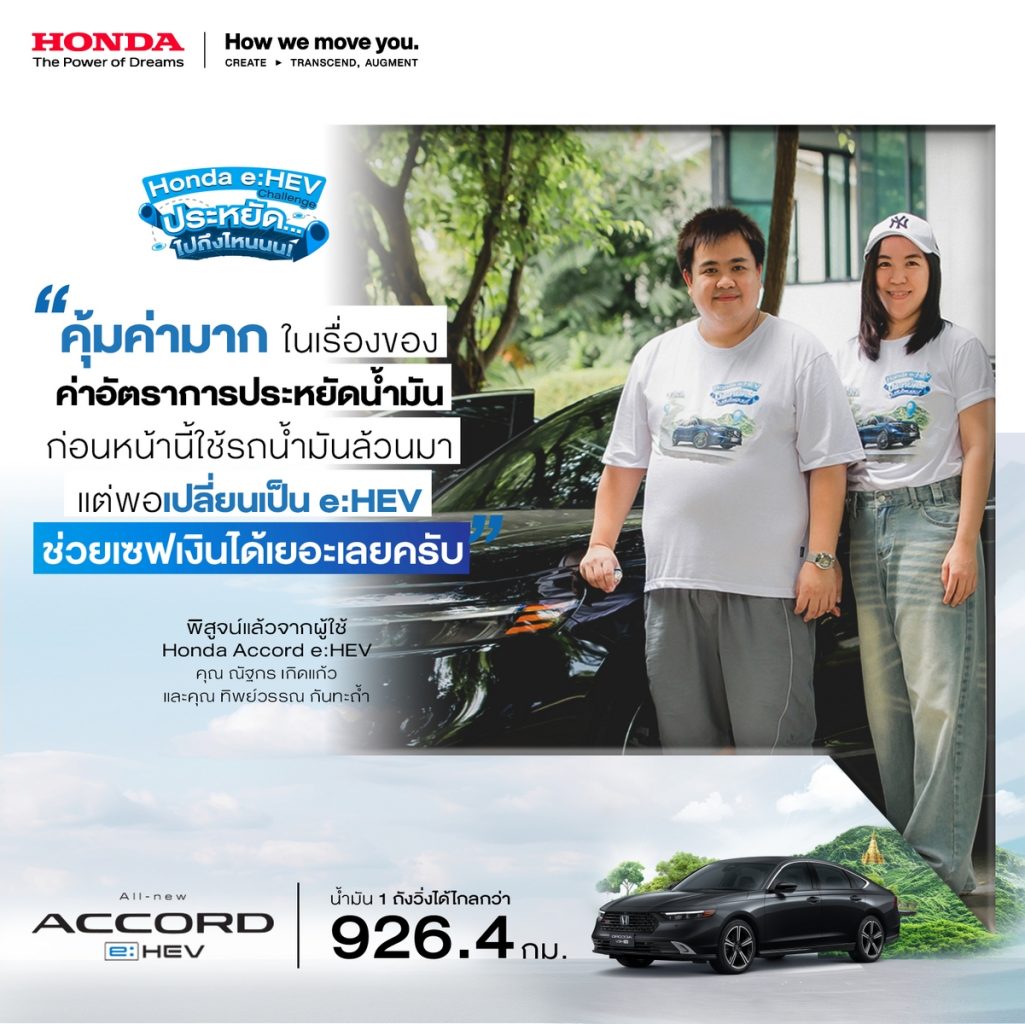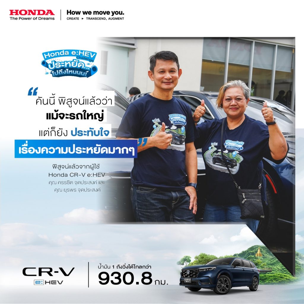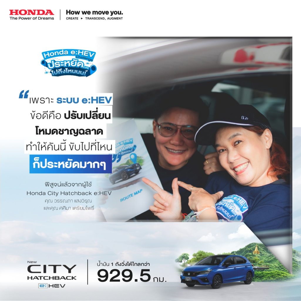 บริษัท ฮอนด้า ออโตโมบิล (ประเทศไทย) จำกัด ตอกย้ำความประหยัดของระบบฟูลไฮบริด e:HEV ผ่านทริปสุดพิเศษ ‘Honda e:HEV Challenge ประหยัด… ไปถึงไหนนน!’ แท็กทีมลูกค้ารถยนต์ Honda e:HEV ทั้ง 6 รุ่น จำนวน 30 คัน รวมผู้ขับขี่พร้อมผู้โดยสารทั้ง 60 คน และคณะสื่อมวลชนสายยานยนต์ ร่วมพิสูจน์ความประหยัดน้ำมัน และสมรรถนะการขับขี่ของระบบขับเคลื่อนฟูลไฮบริด e:HEV กับน้ำมัน 1 ถัง บนเส้นทางการขับขี่จริงจากกรุงเทพฯ – พิษณุโลก – เชียงใหม่ รวมระยะทางกว่า 900 กิโลเมตร โดยผลลัพธ์จากกิจกรรมพบว่ารถยนต์ Honda e:HEV ทุกรุ่น สามารถขับขี่ได้ไกลเกินกว่า 900 กิโลเมตร ด้วยน้ำมันเพียงถังเดียว* โดยไม่มีการแวะเติมน้ำมัน คอนเฟิร์มความประหยัดจากลูกค้าผู้ใช้งานจริง กับสถิติตัวเลขอัตราการประหยัดน้ำมันที่ดีเยี่ยมเกินกว่าป้ายข้อมูลรถยนต์ตามมาตรฐานสากล หรือ ECO Sticker* อีกทั้งลูกค้ายังได้ร่วมแลกเปลี่ยนเคล็ดลับการขับขี่ที่ตอกย้ำความประหยัดอีกขั้น พร้อมเชิญชวนผู้ที่สนใจร่วมสัมผัสและพิสูจน์ความประหยัดของ Honda e:HEV ทุกรุ่นด้วยตัวคุณเอง และให้ทุกท่านสามารถเป็นเจ้าของได้ด้วยข้อเสนอพิเศษ ณ โชว์รูมฮอนด้าทั่วประเทศ