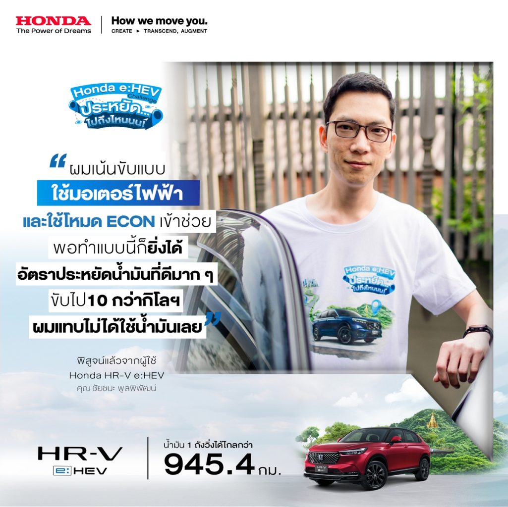 คุณชัยชนะ พูลพิพัฒน์ ลูกค้าผู้ใช้รถยนต์ ฮอนด้า เอชอาร์-วี อี:เอชอีวี กล่าวว่า“เคล็ดลับของผม คือ เน้นการขับขี่ที่ใช้มอเตอร์ไฟฟ้าเป็นหลัก โดยใช้ความเร็วที่ประมาณ 60 ถึง 70 กิโลเมตรต่อชั่วโมง ทำให้ได้อัตราการประหยัดน้ำมันที่ดี ในทางเรียบอาจจะไม่ได้มีความแตกต่างกันมาก แต่ในช่วงเวลาที่ขึ้นหรือลงเนินเขา จะต้องจับจังหวะการหน่วงให้ดี โดยช่วงขึ้นเขาอาจจะใช้โหมด ECON รวมถึงให้รถขยับช้า ๆ เพื่อให้เป็นไฟฟ้า และในจังหวะที่ลงเขาก็จะให้รถชาร์จไฟกลับ น่าจะเป็นระยะทางประมาณ 10 กว่ากิโลฯ ที่ผมแทบจะไม่ได้ใช้น้ำมันเลย ทำให้ได้ตัวเลขอัตราการประหยัดน้ำมันที่ดีมาก”