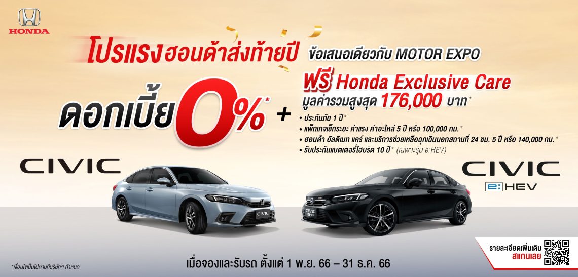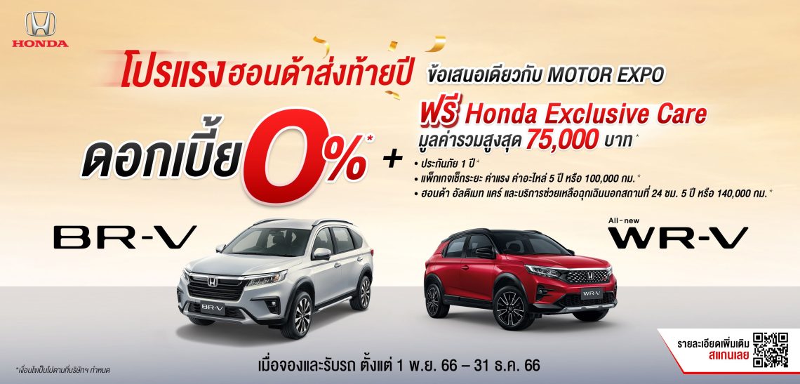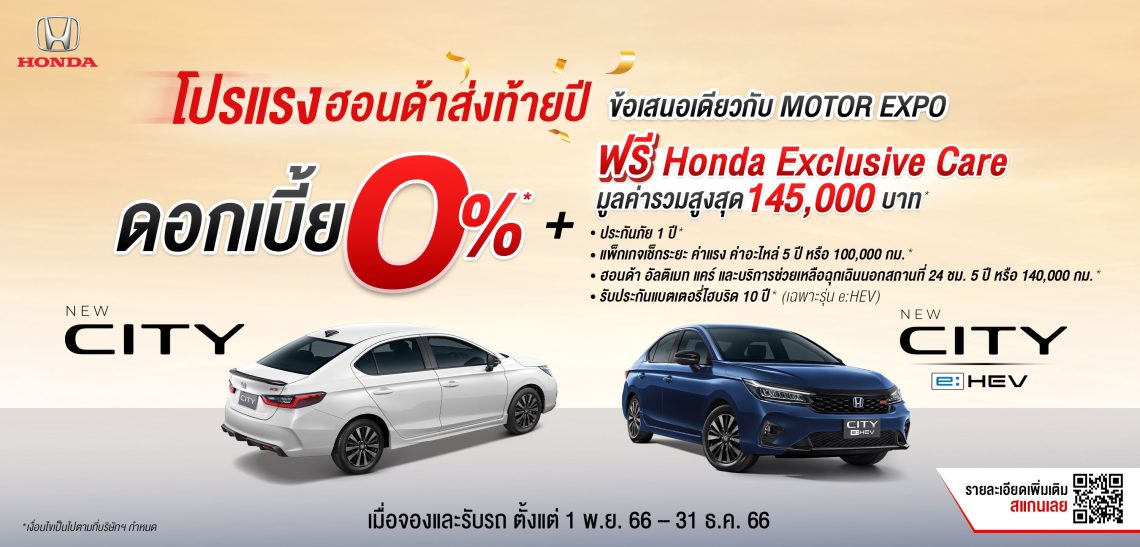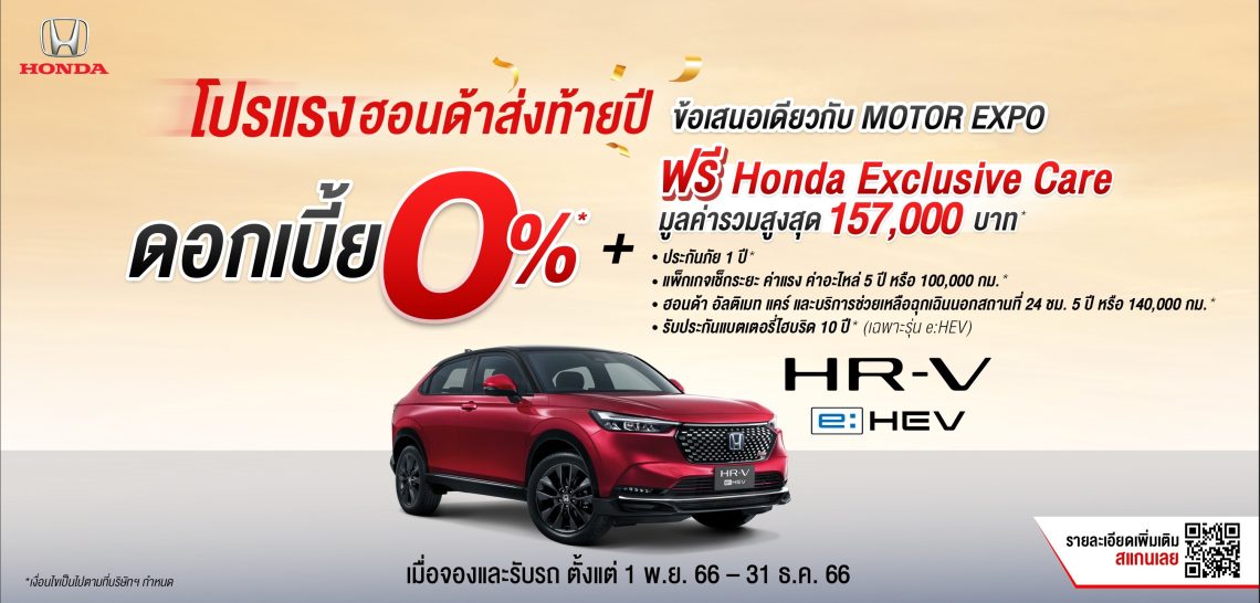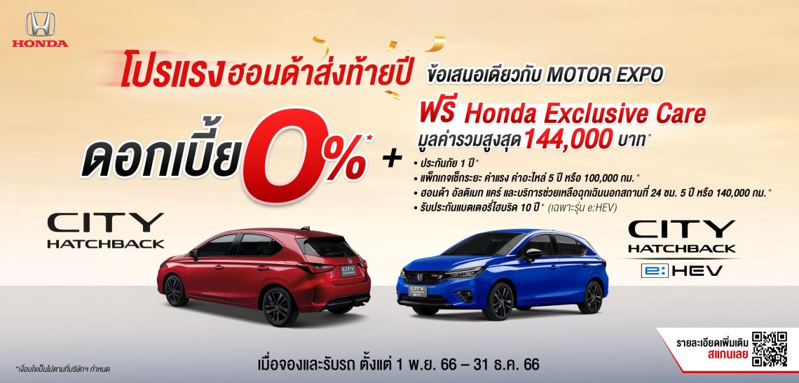 ฮอนด้า จัดโปรโมชันพิเศษต้อนรับเทศกาลแห่งความสุข “โปรแรงฮอนด้าส่งท้ายปี ข้อเสนอเดียวกับ Motor Expo” มาพร้อมดอกเบี้ยพิเศษเริ่มต้น 0% หรือฮอนด้าช่วยผ่อน นาน 12 เดือน รวมมูลค่าสูงสุดถึง 54,000 บาท* พร้อมรับ ฮอนด้า เอ็กซ์คลูซีฟ แคร์ (Honda Exclusive Care)เมื่อจองและรับรถยนต์ฮอนด้ารุ่นที่ร่วมรายการ ตั้งแต่วันที่ 1 พ.ย. 2566 – 31 ธ.ค. 2566