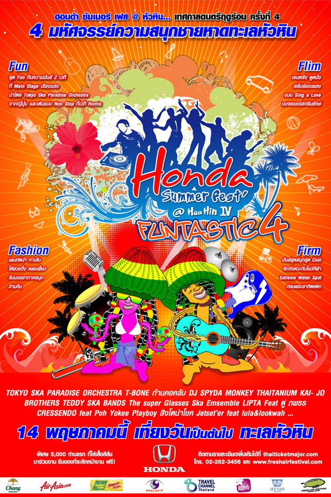 คุณวินิจ เลิศรัตนชัย ประธานเจ้าหน้าที่บริหาร บริษัท เฟรชแอร์ เฟสติวัล จำกัด เผยว่า “Honda Summer Fest’ @ Hua-Hin ครั้งที่ 4 เทศกาลดนตรีริมชายหาดที่มีเอกลักษณ์โดดเด่น จัดขึ้นอย่างต่อเนื่องมาเป็นเวลา 3 ปี มีจำนวนผู้เข้าร่วมงานเพิ่มขึ้นตลอดทุกปี และเมื่อปี 2553 ที่ผ่านมา มีจำนวนผู้เข้าร่วมงานมากถึง 300,000 คน คอนเซ็ปต์งานในปีนี้คือ “4 มหัศจรรย์ความสนุกบนชายหาดทะเลหัวหิน” บรรยากาศโดยรวมจะ มีความสนุกสนานมากขึ้น กับแนวดนตรีแนว สกาเรกเก้, ป๊อป แดนซ์ และ น้องใหม่อย่าง Surf Music และไฮไลท์ที่สำคัญของงานครั้งนี้คือการมาเยือนของวงสกาสัญชาติญี่ปุ่น ที่คอสกาทุกคนรู้จักกันดี “Tokyo Ska Paradise Orchestra” และพิเศษกับคอนเสิร์ตเรืองแสงเต็มรูปแบบ Glow in the Dark”