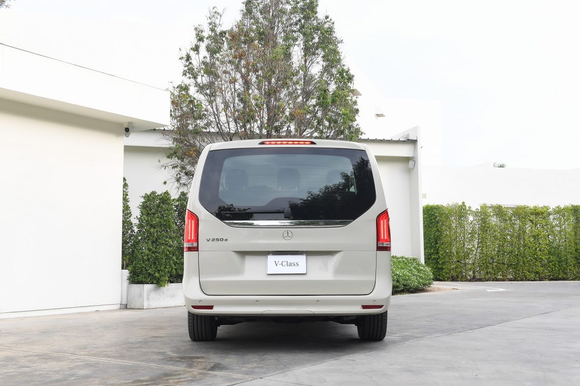 Mercedes-Benz V 250 d Exclusive เป็นรถแวนแบบ 3 ตอน 7 ที่นั่ง จัดรูปแบบการนั่งแบบ 2-2-3 โดยออกแบบตัวถังแบบ Extra Long ด้วยมิติตัวถังทั้งความกว้าง ความยาว ความสูง อยู่ที่ 1,928 x 5,370 x 1,909 มม. ทำให้มีพื้นที่ใช้สอยในส่วนของพื้นที่โดยสารและพื้นที่บรรทุกสัมภาระที่มากขึ้น โดยมีความจุสัมภาระสูงสุด 1,410 ลิตร และความจุถังน้ำมัน 70 ลิตร ส่วนการตกแต่งภายนอกจะคงความภูมิฐานและแฝงด้วยความสปอร์ตด้วยการตกแต่งแบบ Avantgarde รอบคัน รวมถึงล้ออัลลอยด์ 5-Twin Spoke ขนาด 18 นิ้ว พร้อมไฟหน้าแบบ LED Intelligent Light System ที่จะปรับลำแสงตามสภาพแวดล้อมแบบอัตโนมัติ และ Day Time Running Light รวมถึงการติดตั้งระบบไฟฟ้าสำหรับประตูบานเลื่อนของผู้โดยสารตอนที่ 2 และประตูท้าย (EASY-PACK tailgate) พร้อมติดตั้งระบบกันสะเทือนแบบ AGILITY CONTROL ช่วยซับแรงกระแทกและทำให้ช่วงล่างมีความนุ่มนวลยิ่งขึ้น