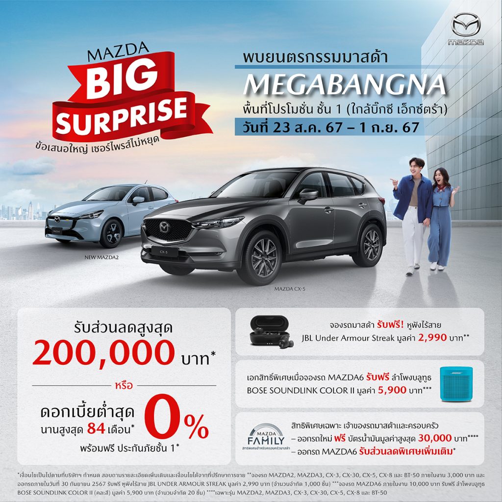 มาสด้า เปิดเกมรุกตลาดหนักช่วงกลางปี จัดโปรแรงแห่งปี เอาใจคนอยากเป็นเจ้าของรถยนต์มาสด้า จัดงาน “Mazda Big Surprise รับข้อเสนอใหญ่ เซอร์ไพรส์ไม่หยุด” ยกทัพยานยนต์สายพันธุ์สปอร์ต ภายใต้เทคโนโลยีสกายแอคทีฟ ให้ลูกค้าเลือกช็อปตามใจชอบ พร้อมรับข้อเสนอสุดพิเศษและของที่ระลึกอีกเพียบ ในกิจกรรม มาสด้า เอ็กซ์โป จัดระหว่างวันที่ 23 สิงหาคม ถึงวันที่ 1 กันยายน 2567 ที่เมกา บางนา