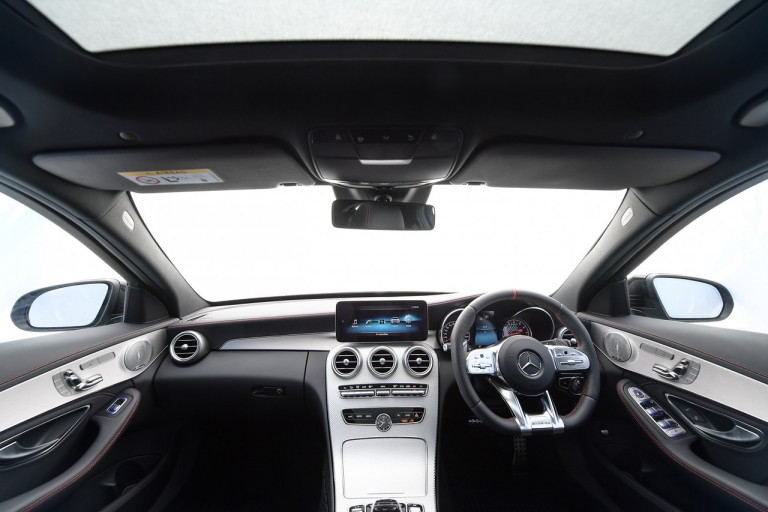 ว่ากันที่ภายในห้องโดยสาร ซึ่งมากับสไตล์การตกแต่งแบบ AMG Matt Silver Glass-Fibre เริ่มจากชุดเบาะนั่ง ซึ่งจัด AMG Sport Seats มาให้นั่งสบายๆ ด้วยวัสดุหุ้มหนัง ARTICO ตัดสลับ DINAMICA พร้อมระบบการอุ่นเบาะที่ปรับได้ 3 ระดับ และพนักพิงศีรษะที่ออกแบบเป็นพิเศษ เพื่อช่วยกระตุ้นอารมณ์ความสปอร์ต