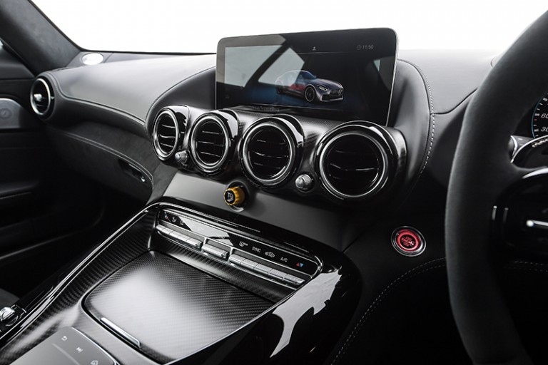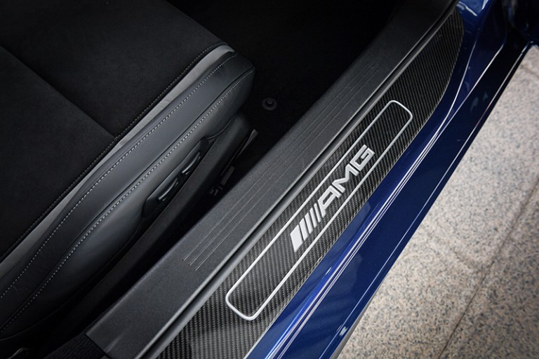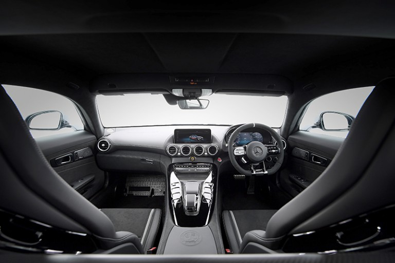 ด้านภายในห้องโดยสารได้รับการตกแต่งด้วยออพชั่น AMG Interior Piano Lacquer Package ผสานด้วยชุดออพชั่น AMG Interior Night Package เสริมด้วยความสปอร์ตเร้าใจ จากเบาะนั่งแบบ AMG Sport Bucket Seats หุ้มด้วยหนัง Nappa / DINAMICA Microfibre สีดำ, พวงมาลัยแบบ AMG Performance Steering Wheel หุ้มด้วย DINAMICA Microfibre สีดำ