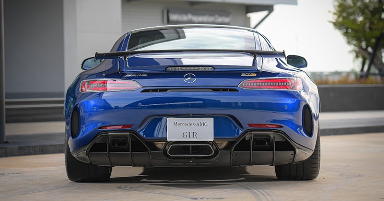 ขณะที่ด้านหลังเสริมความโหด ด้วยชุดกันชนหลังที่ออกแบบให้รับกับท่อไอเสีย AMG Performance Exhaust System เสริมด้วยสปอยเลอร์แบบ Static Rear Aerofoil พร้อมกับด้านบนหลังคากที่ลดน้ำหนักลงด้วยวัสดุ Carbon Fibre ปิดท้ายด้วยการยกระดับความดุ ด้วยชุดออพชั่น AMG Exterior Night Package