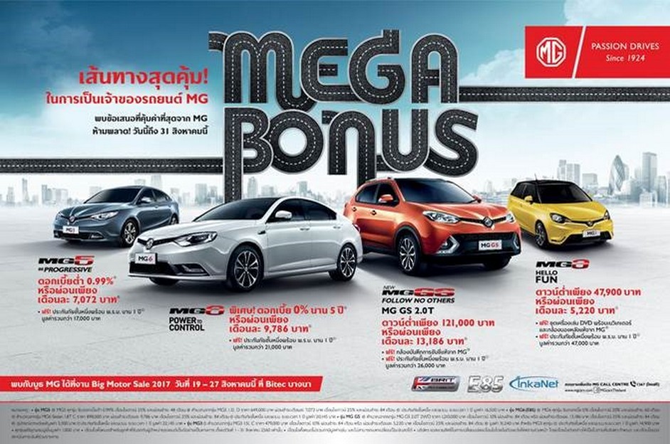 MG เข้าร่วมงานมหกรรมยานยนต์เพื่อขายแห่งชาติ หรือ BIG Motor Sales 2017 ด้วยการจัดแสดงขบวนรถยนต์ เอ็มจี ทุกรุ่น พร้อมอัดเต็มกับโปรโมชั่น เอ็มจี เมกะ โบนัส (MG MEGA BONUS) เพื่อเอาใจผู้ที่หลงใหลและชื่นชอบยนตรกรรมสัญชาติอังกฤษ