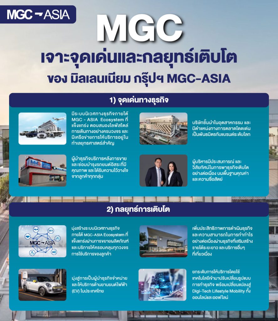 บมจ.มิลเลนเนียม กรุ๊ป คอร์ปอเรชั่น (เอเชีย) หรือ ‘มิลเลนเนียม กรุ๊ปฯ MGC-ASIA’ แสดงวิสัยทัศน์ผู้นำธุรกิจค้าปลีกยานยนต์ Lifestyle Mobility Ecosystem วางกลยุทธ์ขับเคลื่อนธุรกิจ พัฒนาระบบนิเวศทางธุรกิจภายใต้กลุ่ม MGC-ASIAสู่ธุรกิจที่มีศักยภาพเติบโตสูงในอนาคต เพื่อให้ครอบคลุมทุกวงจรการใช้บริการของลูกค้า และสร้างการเติบโตอย่างยั่งยืน เตรียมพร้อมเดินหน้าเสนอขาย IPO เข้าจดทะเบียนในตลาดหลักทรัพย์แห่งประเทศไทย