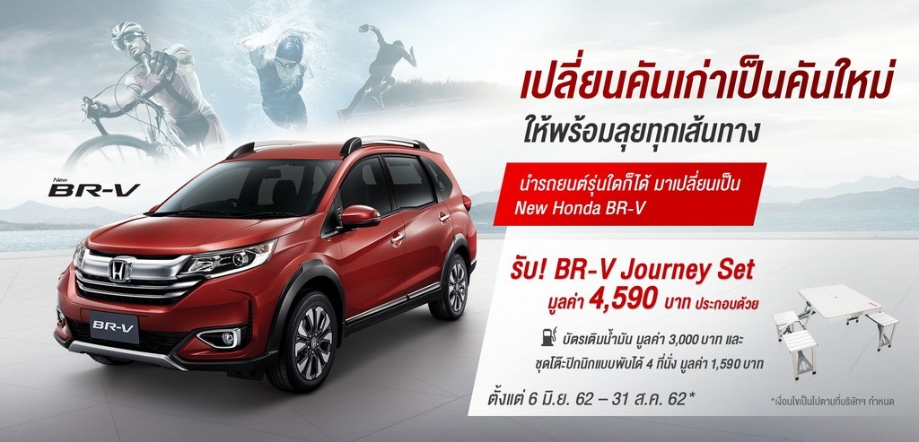 ฮอนด้า บีอาร์-วี ใหม่ มีให้เลือกทั้งหมด 6 สี ได้แก่ สีแดงแพสชั่น (มุก) ใหม่ สีขาวแพลทินัม (มุก) ใหม่ สีเงินลูนาร์ (เมทัลลิก) สีเทาโมเดิร์นสตีล (เมทัลลิก) สีดำคริสตัล (มุก) และสีขาวทาฟเฟต้า พร้อมกันนี้ ฮอนด้ายังจัดแคมเปญ “เปลี่ยนคันเก่าเป็นคันใหม่ ให้พร้อมลุยทุกเส้นทาง” เมื่อลูกค้านำรถยนต์รุ่นใดก็ได้มาขายเพื่อเปลี่ยนเป็น ฮอนด้า บีอาร์-วี ใหม่ ที่โชว์รูมฮอนด้าทั่วประเทศ มีสิทธิ์รับทันที BR-V Journey Set มูลค่า 4,590 บาท ซึ่งประกอบด้วยบัตรเติมน้ำมันมูลค่า 3,000 บาท และชุดโต๊ะปิกนิกแบบพับได้ 4 ที่นั่ง มูลค่า 1,590 บาท ตั้งแต่วันที่ 6 มิถุนายน 2562 – 31 สิงหาคม 2562 อีกทั้งมอบข้อเสนอสุดพิเศษ “Double Smile” ดาวน์ 0 บาท หรือเลือกผ่อนสบายเริ่มต้น 9,000 บาท* ให้แก่ลูกค้าที่จอง ฮอนด้า บีอาร์-วี ใหม่ ตั้งแต่ 6 มิถุนายน 2562 – 30 มิถุนายน 2562 ณ โชว์รูมฮอนด้าทั่วประเทศ