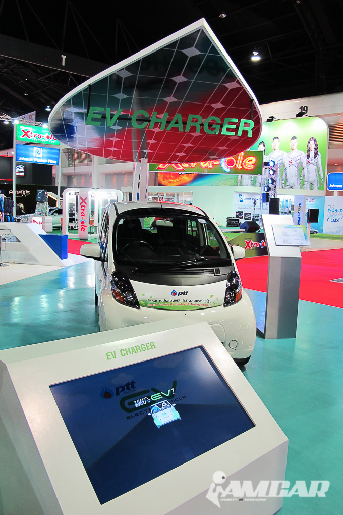 ในส่วนของนวัตกรรมเพื่อสิ่งแวดล้อม ปตท. ยังได้นำ สถานีเติมไฟฟ้า (EV CHARGER) สำหรับรถยนต์ไฟฟ้า ELECTRIC VEHICLE (รถ EV) ซึ่งขับเคลื่อนด้วยมอเตอร์ไฟฟ้า มาจัดแสดง โดยสามารถประจุไฟฟ้าเข้าแบตเตอรี่ได้โดยการเสียบปลั๊ก ทั้งแบบ Quick Charge ซึ่งใช้เวลาประมาณ 30 นาที และ Normal Charge ซึ่งใช้เวลาประมาณ 6-8 ชั่วโมง โดยสามารถขับเคลื่อนได้ระยะทาง 100-300 กิโลเมตร ขึ้นอยู่กับขนาดของแบตเตอรี่ ทั้งนี้ การมช้ไฟฟ้าในการขับเคลื่อนรถยนต์ จะมีส่วนช่วยลดการปล่อยก๊าชเรือนกระจก และมีค่าไฟฟ้าในการขับเคลื่อนประมาณ 50 สตางค์ต่อกิโลเมตร โดย ปตท. ได้จัดตั้ง โครงการวิจัยและพัฒนาการใช้ไฟฟ้าในรถยนต์ (R&D On Vehicle Electrification) เพื่อเตรียมความพร้อม รองรับเทคโนโลยีการใช้ไฟฟในรถยนต์ และได้ก่อสร้างสถานีประจุไฟฟ้าต้นแบบ (PTT Pilot EV Charging Station) ณ สถาบันวิจัย และเทคโนโลยี ปตท. อ.วังน้อย จ.พระนครศรีอยุธยา ซึ่งเปิดใช้อย่างเป็นทางการ เมื่อเดือนกันยายน พ.ศ. 2555 ที่ผ่านมา และ ปตท. มีแผนขยายเครือข่ายสถานีเติมไฟฟ้าเพิ่มเติม ในปี 2556 อีก 5 สถานี ในเส้นทาง กรุงเทพฯ-ชลบุรี-ระยอง อีกด้วย