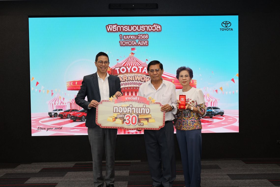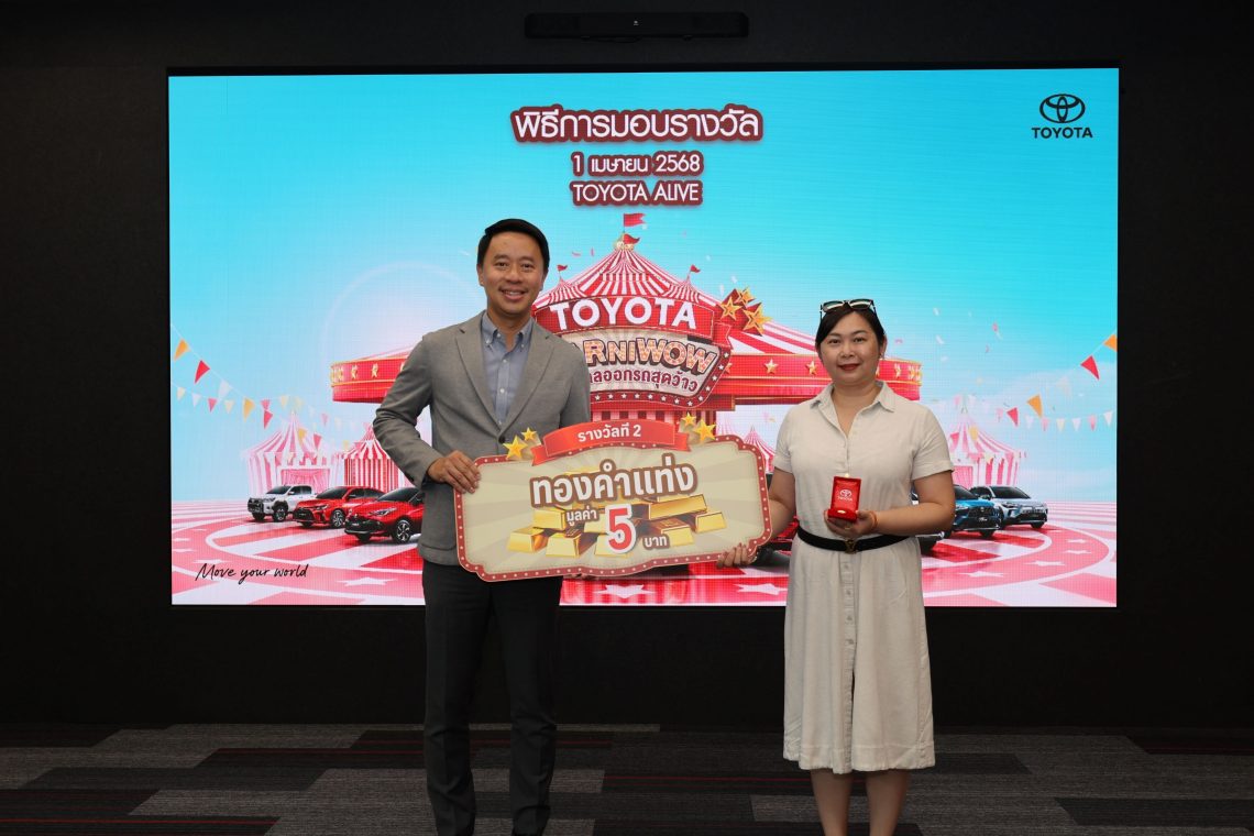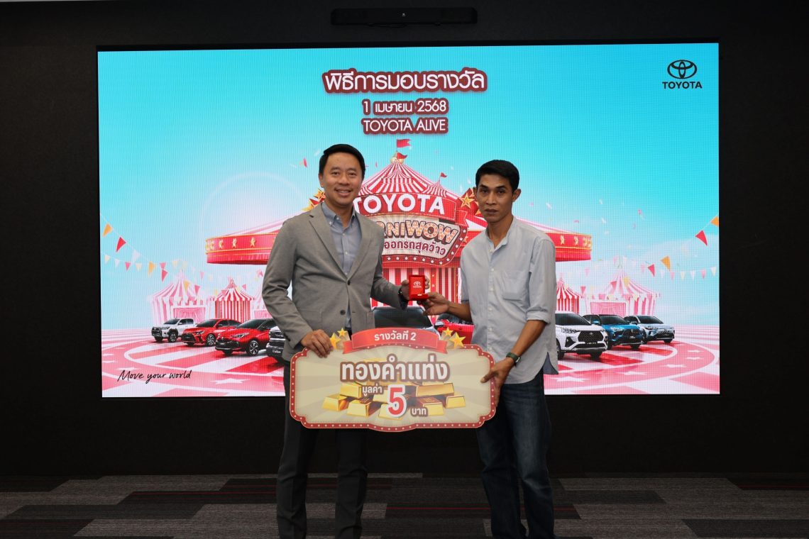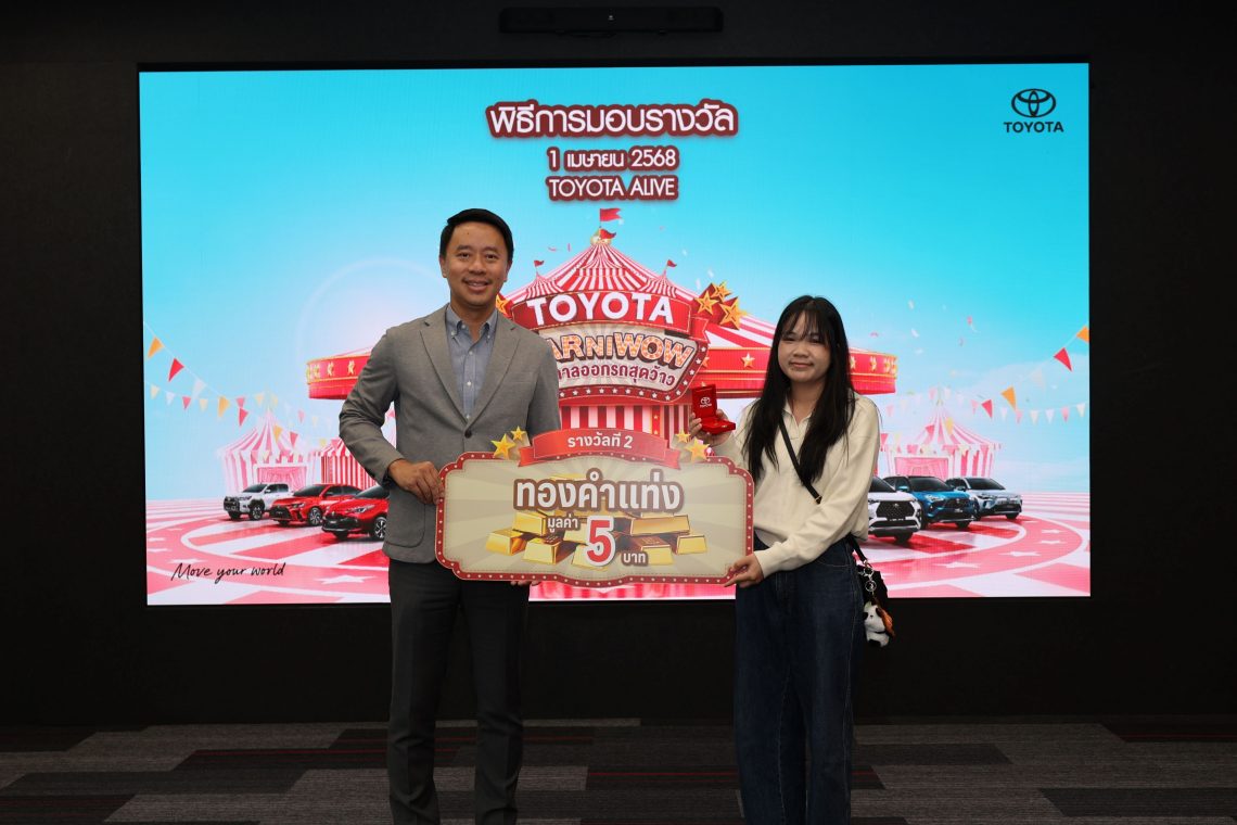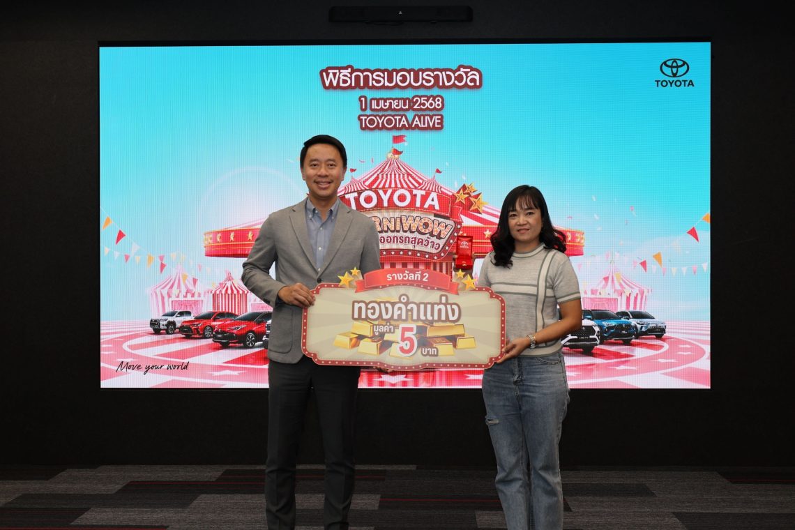 บริษัท โตโยต้า มอเตอร์ ประเทศไทย จำกัด ร่วมแสดงความยินดีกับผู้โชคดี จากกิจกรรม “TOYOTA CARNIWOW เทศกาลออกรถสุดว้าว” ที่ได้รับ ทองคำแท่ง 30 บาท และ ทองคำแท่ง 5 บาท โดยมี นายณัทธร ศรีนิเวศน์ ผู้ช่วยกรรมการผู้จัดการใหญ่ พร้อมด้วย นายสมุทร ตังคชวนะ ผู้อำนวยการฝ่ายการตลาดรถยนต์นั่ง บริษัท โตโยต้า มอเตอร์ ประเทศไทย จำกัด เป็นผู้มอบรางวัล เมื่อวันที่ 1 เมษายน 2568 ณ TOYOTA ALIVE บางนา