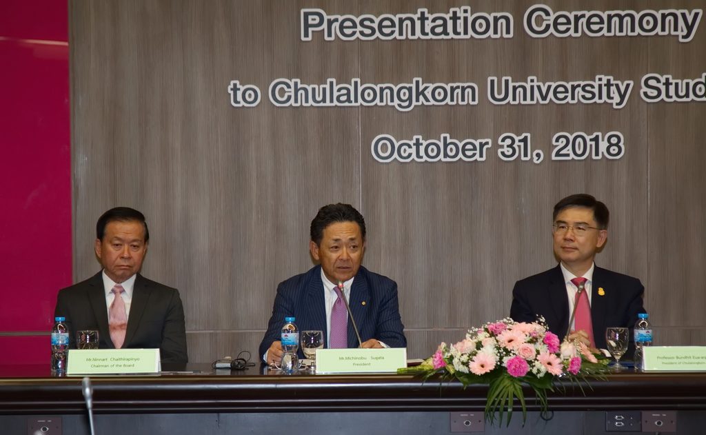 มร.มิจิโนบุ ซึงาตะ เจ้าหน้าที่บริหาร บริษัท โตโยต้า มอเตอร์ คอร์ปอเรชั่น ประเทศญี่ปุ่น และกรรมการผู้จัดการใหญ่ บริษัท โตโยต้า มอเตอร์ ประเทศไทย จำกัด พร้อมด้วย ศ.ดร.บัณฑิต เอื้ออาภรณ์ อธิการบดีจุฬาลงกรณ์มหาวิทยาลัย เข้าร่วมเป็นประธานในพิธีมอบทุนการศึกษาประจำปี พ.ศ.2561 แก่นิสิตจุฬาลงกรณ์มหาวิทยาลัย เพื่อสนับสนุนให้นิสิตที่เรียนดีแต่ขาดแคลนทุนทรัพย์ ได้รับโอกาสทางการศึกษาอย่างต่อเนื่อง พร้อมส่งเสริมให้นิสิตนำความรู้ที่ได้รับจากการศึกษา ไปพัฒนาสังคมไทยให้เติบโตอย่างยั่งยืน เมื่อวันที่ 31 ตุลาคม 2561 ณ อาคารจามจุรี 4 ห้องประชุม 202 จุฬาลงกรณ์มหาวิทยาลัย