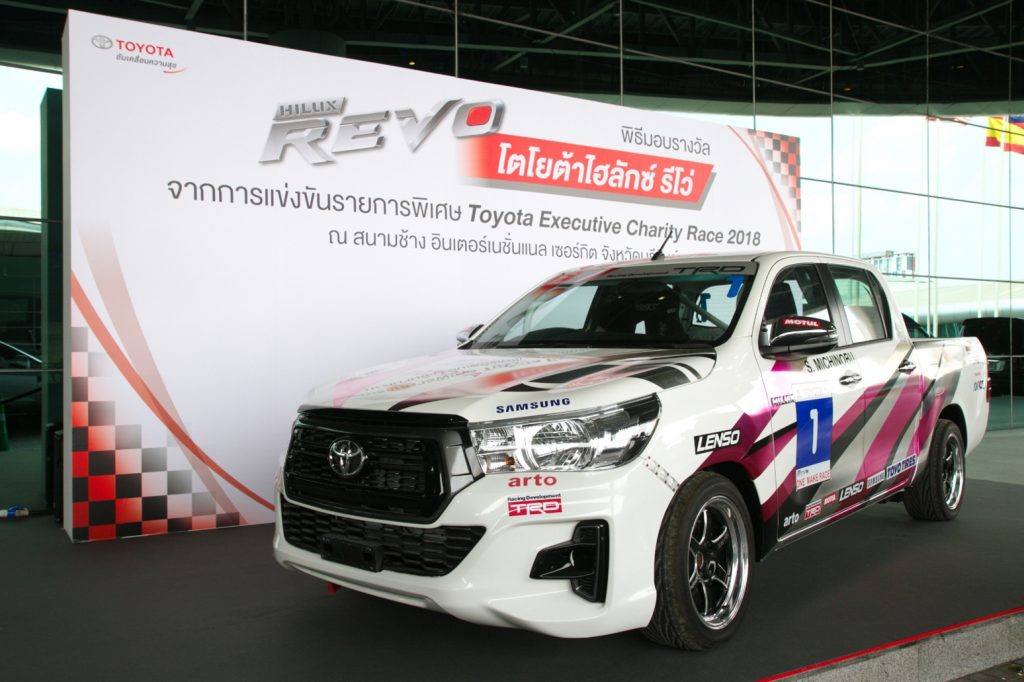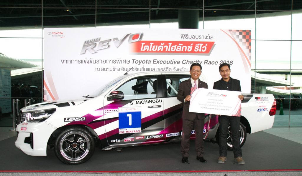 มร.มิจิโนบุ ซึงาตะ กรรมการผู้จัดการใหญ่ บริษัท โตโยต้า มอเตอร์ ประเทศไทย จำกัด ส่งมอบรถโตโยต้า ไฮลักซ์ รีโว่ ให้กับ คุณสุทธิรักษ์ รักษาพล ผู้โชคดีจากกิจกรรมลุ้นรับรถโตโยต้า ไฮลักซ์ รีโว่ ที่ชนะจากการแข่งขันพิเศษ Toyota Executive Charity Race 2018 ซึ่งจัดขึ้นเมื่อ 28 ตุลาคม ปีที่ผ่านมา ณ สนามช้าง อินเตอร์เนชั่นแนล เซอร์กิต จังหวัดบุรีรัมย์ ทั้งนี้ การแข่งขันพิเศษ Toyota Executive Charity Race 2018 เป็นการนำรถกระบะ ไฮลักซ์ รีโว่ ดับเบิ้ลแค็บ 4×2 จำนวน 6 คัน ทำการแข่งขันโดยผู้บริหารโตโยต้า และประธานชมรมผู้แทนจำหน่ายโตโยต้า เพื่อนำเงินรางวัลจากการแข่งขันมอบให้กับมูลนิธิ และโรงพยาบาลในจังหวัดบุรีรัมย์รวม 6 แห่ง ได้แก่ มูลนิธิ ซี.ซี.เอฟ. เพื่อเด็กและเยาวชน ในพระราชูปถัมภ์สมเด็จพระเทพรัตนราชสุดาฯ สยามบรมราชกุมารี มูลนิธิบ้านแห่งความหวังบุรีรัมย์ บ้านพักเด็กและครอบครัวจังหวัดบุรีรัมย์ สถานพินิจและคุ้มครองเด็กและเยาวชนจังหวัดบุรีรัมย์ มูลนิธิสว่างจรรยาธรรมและโรงพยาบาลบุรีรัมย์
