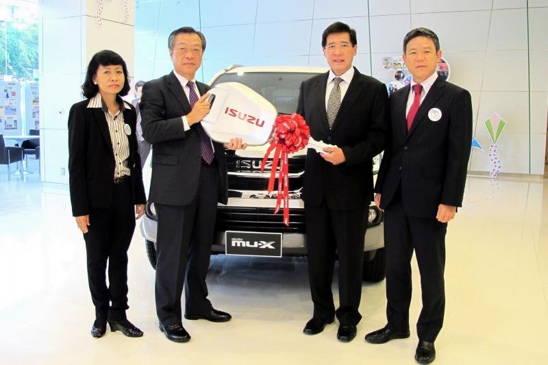 มร. เอช. นาคางาวะ (ที่ 2 จากซ้าย) กรรมการผู้จัดการ พร้อมด้วยคุณปนัดดา เจณณวาสิน (ที่ 1 จากซ้าย) รองกรรมการผู้จัดการอาวุโส และ มร. เค. คนโด้ (ที่ 1 จากขวา) รองกรรมการผู้จัดการอาวุโส บริษัท ตรีเพชรอีซูซุเซลส์ จำกัด ร่วมส่งมอบ “อีซูซุมิว-เอ็กซ์” สีขาวมุกเอเวอร์เรสต์ ยอดยนตรกรรมอเนกประสงค์ระดับหรู เอกสิทธิ์แห่งผู้นำ ให้แก่ คุณกิตติพันธ์ เหตระกูล กรรมการ บริษัท ยาคูลท์ (ประเทศไทย) จำกัด และผู้อำนวยการฝ่ายขายและจัดจำหน่าย หนังสือพิมพ์เดลินิวส์ ณ อาคารสำนักงานใหญ่ บริษัท ตรีเพชรอีซูซุเซลส์ จำกัด ถนนวิภาวดีรังสิต
