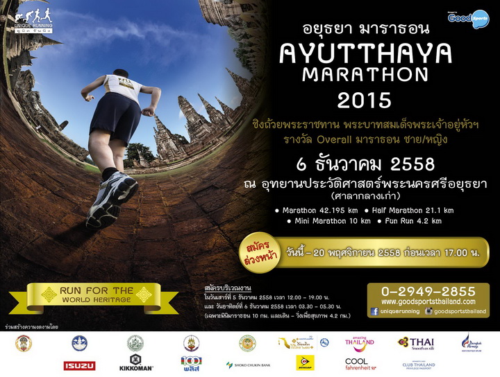 จังหวัดพระนครศรีอยุธยา พร้อมด้วยสำนักงานการท่องเที่ยวและกีฬาจังหวัดพระนครศรีอยุธยา ร่วมกับการท่องเที่ยวแห่งประเทศไทย (ททท.) สำนักงานพระนครศรีอยุธยาสำนักงานโอซาก้า ประเทศญี่ปุ่น และ Good Sports ซึ่งดำเนินงานภายใต้บริษัท ได-อิจิ คิคากุ (ประเทศไทย) จำกัด ร่วมจัดกิจกรรมงานวิ่งเพื่อมรดกโลก “ยูนิค รันนิ่ง อยุธยามาราธอน 2015” ปีที่ 6 ชิงถ้วยพระราชทานพระบาทสมเด็จพระเจ้าอยู่หัวฯ สำหรับผู้ชนะ Overall ระยะมาราธอน ชาย – หญิง โดยกิจกรรมครั้งนี้เล็งเห็นถึงความสำคัญ และคำนึงถึงคุณค่าของมรดกโลกในประเทศไทย พร้อมรณรงค์ปลุกจิตสำนึกคนไทยให้ร่วมใจรักษามรดกโลกอันล้ำค่า ภายใต้แนวคิด “วิ่งเพื่อมรดกโลก” ซึ่งมีนักวิ่ง ตลอดจนนักท่องเที่ยวทั้งชาวไทยและชาวต่างประเทศ ทั้งนักวิ่งกลุ่มเดิมที่เป็นแฟนวิ่งและนักวิ่งหน้าใหม่ ให้ความสนใจและตัดสินใจเข้าร่วมกิจกรรมดีๆ เพื่อรักษามรดกโลกของเราไว้สืบต่อไป ในวันอาทิตย์ที่ 6 ธันวาคมศกนี้