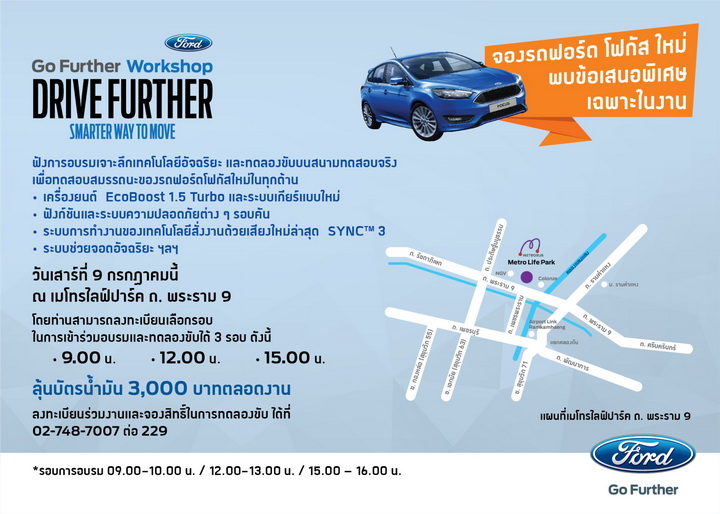 Ford Thailand เชิญผู้สนใจร่วมสัมผัสประสบการณ์การขับขี่และทดสอบสมรรถนะของรถยนต์ระดับโลกรุ่นล่าสุด NEW Ford Focus Eco Boost และรถฟอร์ดรุ่นต่างๆ ทั้ง Ford Ranger ,Ford Everest, Ford EcoSport และ Ford Fiesta บนสนามทดสอบจริงเต็มรูปแบบ พร้อมรับฟังข้อมูลเจาะลึกด้านเทคโนโลยีของรถในงาน Go Further Workshop : Drive Further Smarter Way to Move ระหว่างวันที่ 9–10 กรกฏาคมนี้ ณ เมโทรไลฟ์ ปาร์ค ถนนพระราม 9 สำหรับผู้ลงทะเบียนล่วงหน้าและเข้าร่วมงาน 50 ท่านแรก รับของกำนัลสุดพิเศษจากฟอร์ด พร้อมลุ้นรับบัตรน้ำมันมูลค่า 3,000 บาท และรับข้อเสนอสุดพิเศษเมื่อจองรถยนต์ฟอร์ดทุกรุ่นภายในงาน