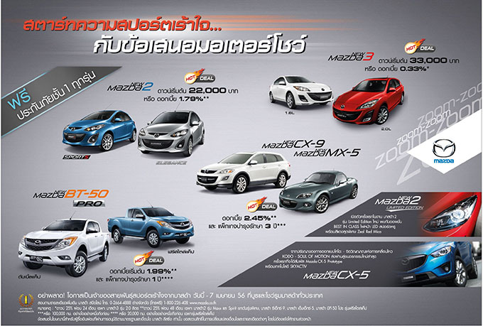 บริษัท มาสด้า เซลส์ (ประเทศไทย) จำกัด ฉลองยอดขายเดือนกุมภาพันธ์ที่พุ่งทะลุเกิน 35% เดินหน้ากระตุ้นตลาดรถยนต์เมืองไทยต่อทันที ด้วยการการงัดกลยุทธ์เด็ดออกแคมเปญต้อนรับมอเตอร์โชว์ “Mazda Hot Deal” ให้ลูกค้าไม่พลาดโอกาสเป็นเจ้าของสายพันธุ์สปอร์ตเร้าใจจากมาสด้า ให้ลูกค้าสามารถเป็นเจ้าของรถยนต์และรถปิกอัพมาสด้าทุกรุ่นได้ง่าย ออกรถวันนี้รับโปรโมชั่นเดียวกันกับงานมอเตอร์โชว์ ด้วยเงินดาวน์เริ่มต้นเพียง 22,000 บาท ดอกเบี้ยต่ำสุดๆ เริ่มต้นถูกกว่าดอกเบี้ยเงินฝากเพียง 33 สตางค์เท่านั้น แถมใจดีให้ฟรีประกันชั้นหนึ่งทุกรุ่น เริ่มแล้ววันนี้ไม่ต้องรอถึงงานมอเตอร์โชว์ หมดเขตถึง 7 เมษายนนี้เท่านั้น