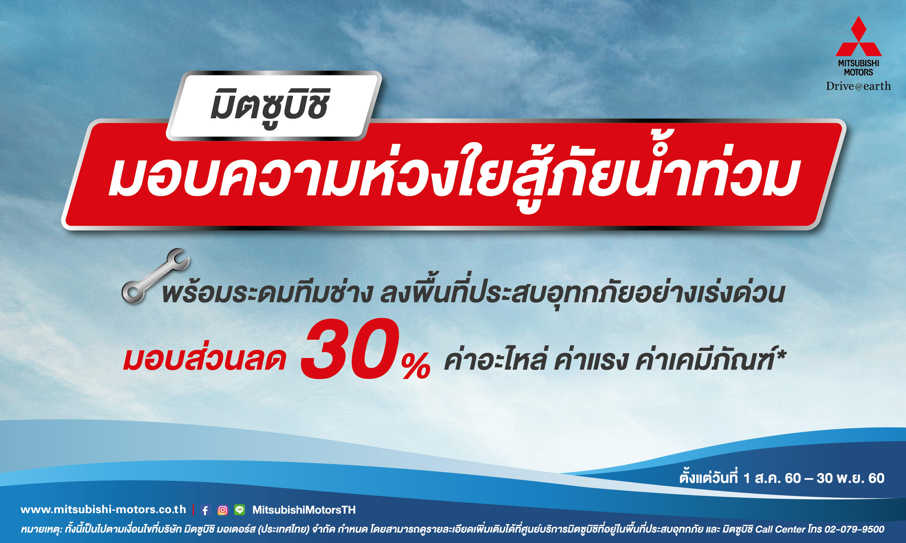 บริษัท มิตซูบิชิ มอเตอร์ส (ประเทศไทย) จำกัด ประกาศให้ความช่วยเหลือลูกค้าและเจ้าของรถยนต์มิตซูบิชิที่ประสบภัยน้ำท่วม โดยร่วมมือกับผู้จำหน่ายรถยนต์มิตซูบิชิ อย่างเป็นทางการที่ตั้งอยู่ในพื้นที่ประสบภัย ด้วยการมอบส่วนลดพิเศษ 30%1  สำหรับค่าอะไหล่2 เคมีภัณฑ์ น้ำมันเครื่อง และค่าแรง เพื่อเป็นการแบ่งเบาภาระให้แก่ลูกค้า มิตซูบิชิ จากวิกฤตในครั้งนี้