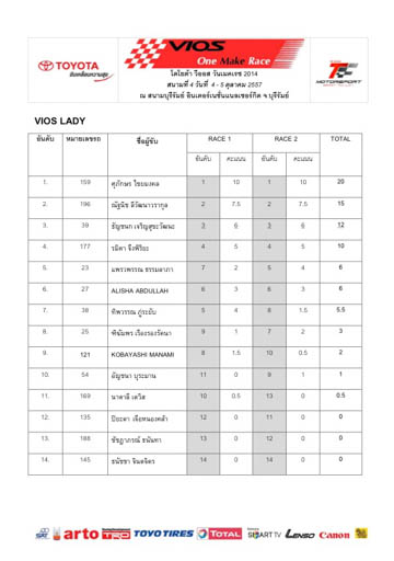 ขณะที่รุ่น “วีออส วันเมคเรซ เลดี้คัพ” “กระแต ศุภักษร ไชยมงคล” นักแข่งสาว จากทีม MY AND CARR G’ZOX ELF BY PHUKET SRISUCHAT โชว์ฟอร์มยอดเยี่ยม ทำเวลารวมทั้งสองเรซ เข้ามาเป็นอันดับ 1 คว้าแชมป์สนามนี้ไปครองตามความคาดหมาย อันดับ 2 ตกเป็นของ “ณัฐนิช ลีวัฒนาวรากุล” จาก MORIN TOP1 RACING TEAM แชมป์เก่าจากสนามเชียงใหม่ โดยมี “ธัญชนก เจริญสุขะวัฒนะ” ตามเข้าเส้นชัยในอันดับที่ 3