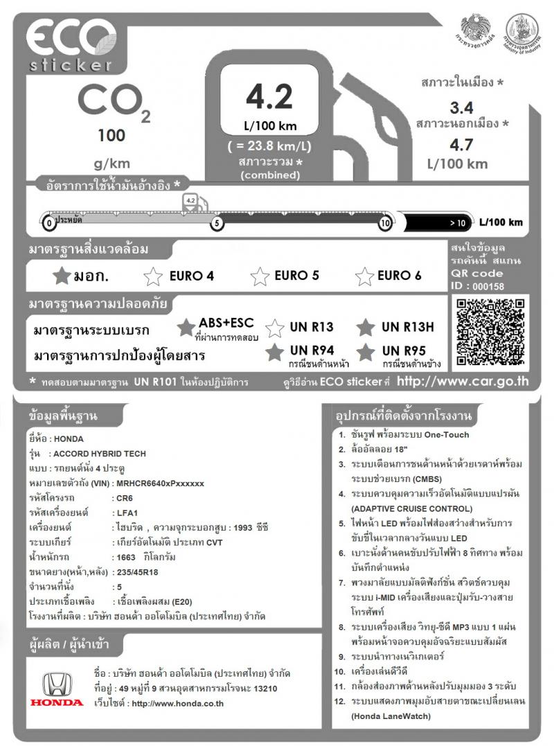 สำหรับป้ายข้อมูลรถยนต์ตามมาตรฐานสากล หรือ ECO Sticker มีขนาดเท่ากับกระดาษ A4 จะติดอยู่บนรถยนต์ใหม่ของฮอนด้าทุกคันที่จัดส่งให้ผู้จำหน่ายตั้งแต่วันที่ 1 ตุลาคม 2558 เป็นต้นไป โดยตำแหน่งในการติดป้ายจะติดไว้ที่กระจกหน้าต่างหลังซ้าย ซึ่งจะประกอบด้วยข้อมูลคุณลักษณะ คุณสมบัติ และสมรรถนะของรถยนต์ตามมาตรฐานสากล โดยมีข้อมูลสำคัญทั้งสิ้น 4 ส่วน ได้แก่