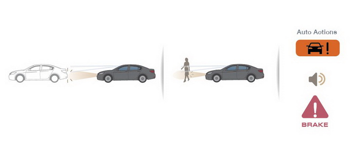 2) ระบบเตือนการชนด้านหน้าและตรวจจับคนเดินถนนด้วยกล้องและเรดาร์พร้อมระบบช่วยเบรก – Collision Mitigation Braking System (CMBS) เมื่อมีรถอยู่ด้านหน้าในระยะที่ไม่ปลอดภัย ระบบจะแจ้งเตือนผ่านหน้าจอแสดงข้อมูลและสัญญาณเสียง รวมถึงมีการสั่นเตือนของพวงมาลัยในกรณีรถสวนทาง หากรถยนต์ยังเข้าใกล้ระยะที่เสี่ยงต่อการชน ระบบจะทำการเสริมแรงเบรกโดยอัตโนมัติ เพื่อลดความเสี่ยงต่อการเกิดอุบัติเหตุ นอกจากนี้ ระบบ CMBS ยังได้รับการพัฒนา