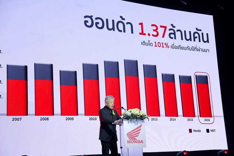 มร.โยอิจิ มิซึทานิ ประธานกรรมการบริหาร บริษัท เอ.พี. ฮอนด้า จำกัด ผู้จัดจำหน่าย รถจักรยานยนต์ ฮอนด้า ในประเทศไทยเปิดเผยว่า “ในปี 2016 ที่ผ่านมา ตลาดรถจักรยานยนต์ไทยได้เริ่มมีสัญญาณเติบโตที่ดีขึ้นหลังจากตกติดต่อกันมาเป็นเวลา 3 ปี โดยมีปริมาณตลาดรวม 1.74 ล้านคัน เติบโตเพิ่มขึ้น 4% จากปีก่อนหน้า สำหรับฮอนด้ามียอดการจำหน่าย 1.37 ล้านคัน เติบโตขึ้น 1% เมื่อเทียบกับปีที่ผ่านม่า ในส่วนของตลาดรถ Big Bike เรามียอดจำหน่าย 9,000 คัน จากตลาดรวม 23,000 คัน ซึ่งทำให้ฮอนด้าเป็นอันดับ 1 ในรถทุกประเภท และเป็นผู้นำตลาดรถจักรยานยนต์ติดต่อกันถึง 28 ปีติดต่อกัน”