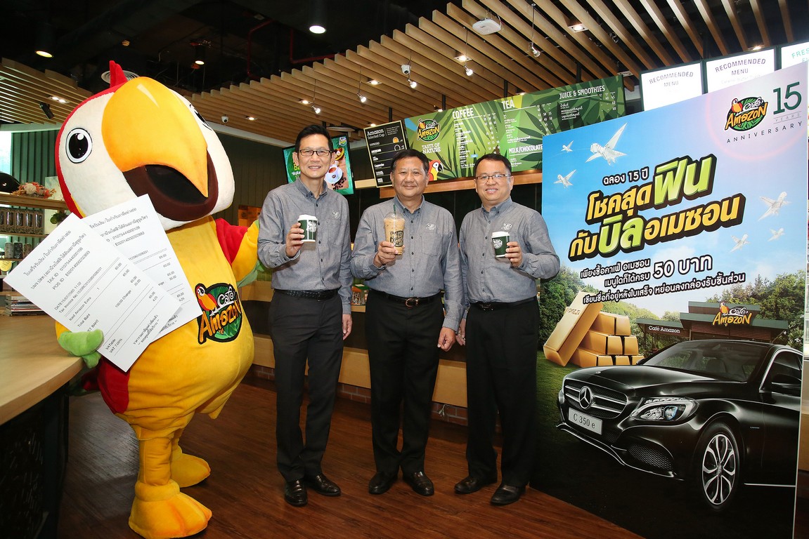 คาเฟ่อเมซอน เชิญชวนผู้บริโภคร่วมฉลอง 15 ปี คาเฟ่อเมซอนกับแคมเปญ “ โชคสุดฟินกับบิล อเมซอน ” ลุ้นรางวัลใหญ่ รถ Mercedez-Benz รุ่น C350 e Plug-in Hybrid 1 รางวัล ทองคำแท่งน้ำหนัก 5 บาท 20 รางวัล และทองคำแท่งน้ำหนัก 1 บาท 100 รางวัล รวมมูลค่าทั้งสิ้นกว่า 6.7 ล้านบาท เมื่อซื้อสินค้าที่ร้านคาเฟ่อเมซอนทุกสาขาครบ 50 บาท/ใบเสร็จ