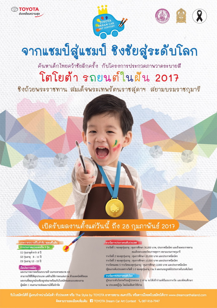 บริษัท โตโยต้า มอเตอร์ ประเทศไทย จำกัด เดินหน้าสานฝันและร่วมสร้างจินตนาการให้กับเยาวชนไทย ผ่านกิจกรรมการ ประกวด วาดภาพระบายสีในหัวข้อ โตโยต้า รถยนต์ในฝัน “ TOYOTA Dream Car Art Contest 2017 ” เพื่อส่งเสริมเยาวชนไทยผู้มีความสนใจในเรื่องศิลปะ ได้มีช่องทางในการแสดงออกถึงความคิดสร้างสรรค์ผ่านผลงานศิลปะ พร้อมสร้างแรงบันดาลใจสู่อนาคต สร้างแชมป์โลก รุ่นสู่รุ่น โดยเริ่มรับสมัครแล้วตั้งแต่วันนี้ – 28 กุมภาพันธ์ 2560