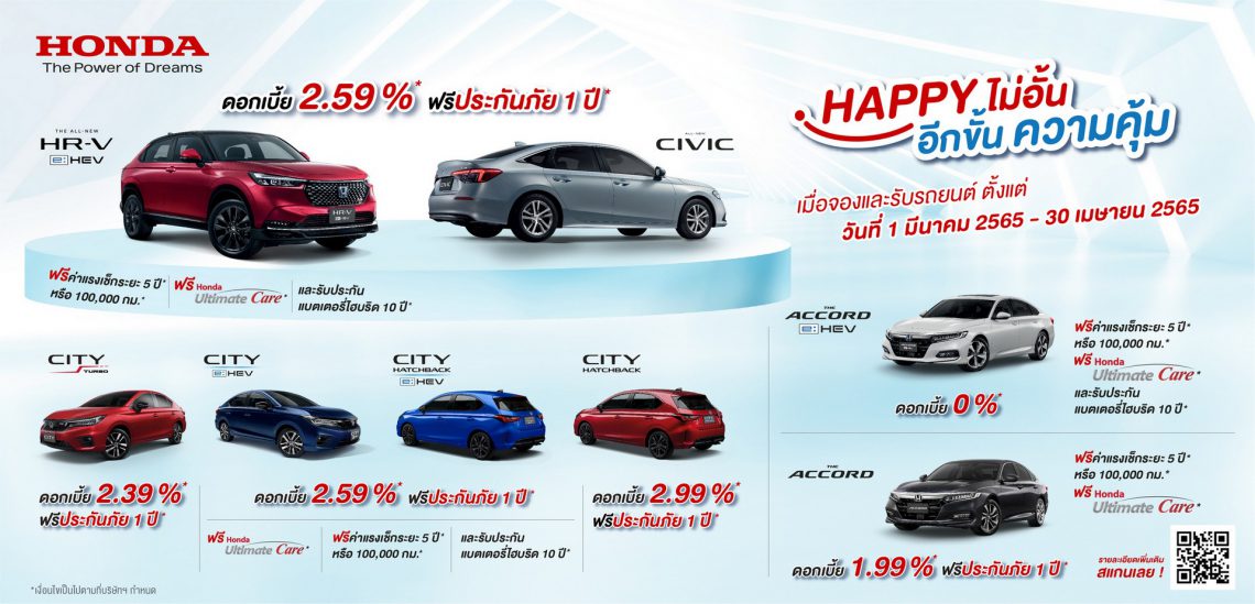 - ไลน์อัปยนตรกรรมเทอร์โบ มาพร้อมดีเอ็นเอความสปอร์ต ที่ให้ทั้งความแรงแต่ยังคงไว้ซึ่งอัตราการประหยัดน้ำมันที่ดีเยี่ยม ได้แก่ ฮอนด้า ซิตี้ เทอร์โบ ฮอนด้า ซิตี้ แฮทช์แบ็ก ฮอนด้า แอคคอร์ด เทอร์โบและไฮไลต์ในกลุ่มนี้ คือฮอนด้า ซีวิค ใหม่ ยนตรกรรมสปอร์ตพรีเมียมซีดานยอดนิยม ดีไซน์ภายนอกสปอร์ตพรีเมียมในทุกมุมมอง ภายในห้องโดยสารกว้างขวางสะดวกสบาย นอกจากนี้ ในทุกรุ่นย่อย ให้ความแรงทรงพลังเร้าใจเกินใคร ด้วยเครื่องยนต์ VTEC TURBO 1.5 ลิตร ใหม่ พร้อมระบบเกียร์ CVT ให้กำลังสูงสุด 178 แรงม้า ให้อัตราการประหยัดน้ำมันดีเยี่ยม 17.2 กม./ลิตร ทั้งยังรองรับพลังงานทางเลือก E85 และมาพร้อมเทคโนโลยีความปลอดภัยอัจฉริยะ Honda SENSING สะดวกสบายแบบเหนือกว่ากับครั้งแรกของระบบควบคุมประตูแบบอัจฉริยะพร้อม Honda Smart Key Card ครบครันด้วยเทคโนโลยีเพื่อความสะดวกสบายและเทคโนโลยีความปลอดภัยอันล้ำสมัย โดยรับข้อเสนอ ดอกเบี้ย 2.59%* พร้อมฟรีประกันภัย 1 ปี* เมื่อจองและรับรถตั้งแต่วันที่ 1 มีนาคม 2565 – 30 เมษายน 2565