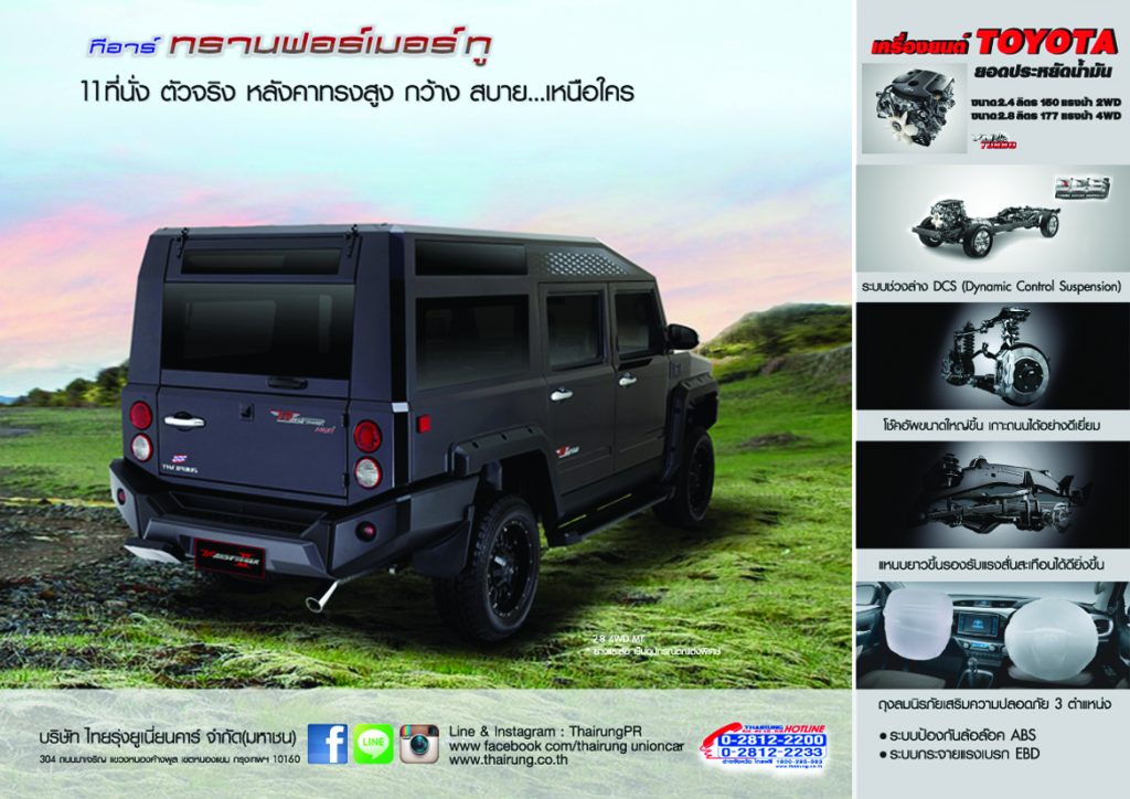 ปี 2516 ตั้งโรงงานประกอบ คือ บริษัท ไทยรุ่งยูเนี่ยนคาร์ จำกัด รับจ้างต่อตัวถังรถกระบะและผลิตอะไหล่ จนในที่สุดจึงได้ดัดแปลงรถกระบะให้มีที่นั่งในห้องโดยสาร เพิ่มขึ้น ด้วยการตัดส่วนกระบะทำห้องโดยสารเพิ่มที่นั่งอีก 1 แถว กลายเป็นรถกระบะแบบ 2 ตอน 4 ประตู ขึ้นเป็นครั้งแรกของประเทศไทยเมื่อปีพ.ศ. 2522 โดยเรียกรถดัดแปลงรุ่นนี้ว่า “ดับเบิ้ล แค็บ” จากจุดเริ่มต้นดังกล่าว ส่งผลให้ไทยรุ่งได้มีโอกาสเป็นผู้ริเริ่มผลิตรถยนต์ดัดแปลง สเตชั่นวากอน เครื่องยนต์อีซูซุ ภายใต้เครื่องหมายการค้า TR ตั้งแต่ปีพ.ศ. 2522 จนได้รับการยอมรับและให้ความไว้วางใจจากบริษัท อีซูซุมอเตอร์ (ประเทศไทย) จำกัดในขณะนั้นให้เป็นผู้ประกอบรถยนต์อเนกประสงค์ 7 ที่นั่งภายใต้ชื่อ TR Adventure จากนั้น พ.ศ. 2543 โดยความร่วมมือจากบริษัท สยามนิสสัน ได้ประกอบรถอเนกประสงค์ 7 ที่นั่งภายใต้ชื่อ TR Xciter และปีพ.ศ.2550 ได้รับการสนับสนุนจากบริษัท เชฟโรเล็ต เซลส์ (ประเทศไทย) จำกัด ประกอบรถยนต์อเนกประสงค์ 7 ที่นั่ง ภายใต้ชื่อ TR Allroader จนปัจจุบัน ได้นำรถ Toyota มาประกอบเป็นรถ TR TRANSFORMER
