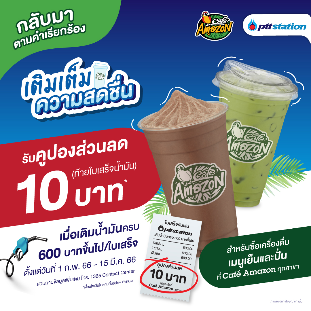 พีทีที สเตชั่น ขอเติมเต็มความสดชื่น มอบโปรโมชั่นพิเศษเฉพาะลูกค้าที่เติมน้ำมันที่สถานีบริการ พีทีที สเตชั่น ทุกสาขาทั่วประเทศที่ร่วมรายการ เมื่อเติมน้ำมันครบ 600 บาทต่อใบเสร็จ รับคูปองส่วนลดท้ายใบเสร็จน้ำมันมูลค่า 10 บาท (จำกัด 1 ใบ/ใบเสร็จ) สำหรับเป็นส่วนลดเครื่องดื่มเมนูเย็นและปั่น ที่ร้านคาเฟ่ อเมซอน ทุกสาขา ตั้งแต่วันที่ 1 ก.พ. 66 – 15 มี.ค. 66 และสามารถใช้ส่วนลดท้ายใบเสร็จได้ตั้งแต่วันที่ 1 ก.พ. 66 – 31 มี.ค. 66
